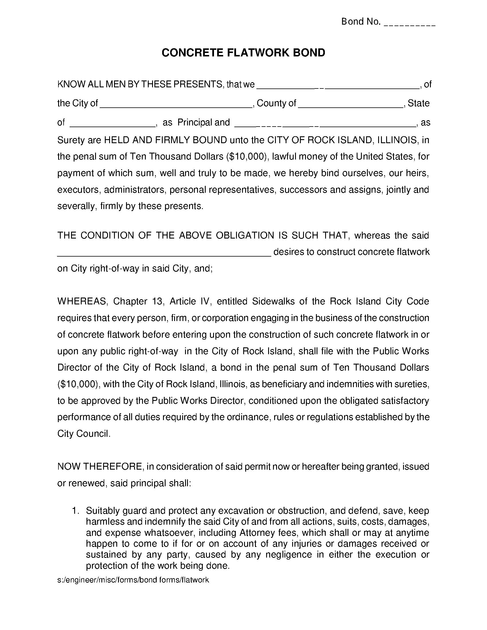 The Illinois City of Rock Island Concrete Flatwork Bond starts at $100 plus shipping costs and fees. Fill out the form to buy your bond instantly!
