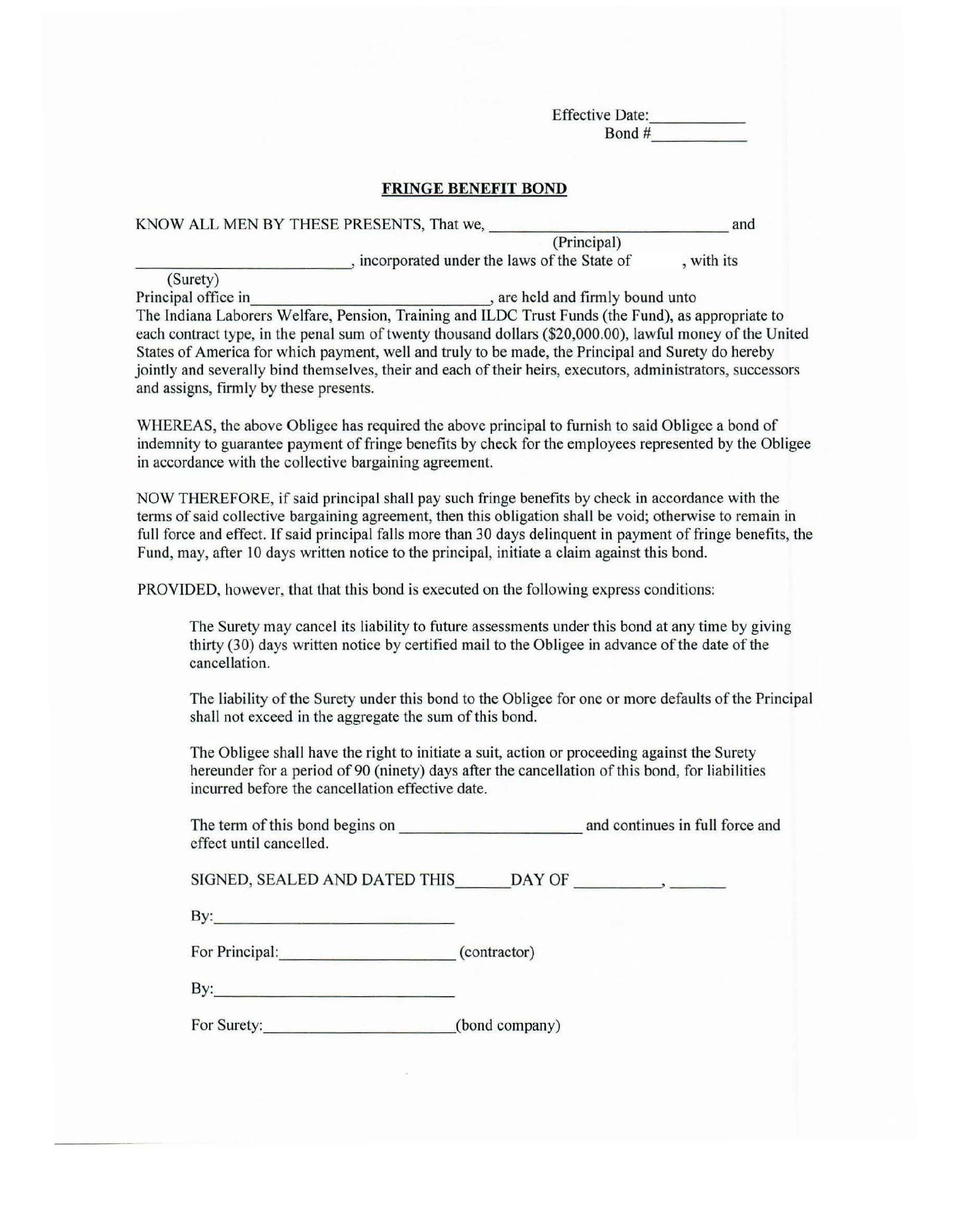 The The Indiana Laborers Welfare, Pension, Training and ILDC Trust Funds Fringe Benefit (Laborers Welfare, Pension, Training, and ILDC Trust Fund) Bond starts at $200 plus shipping costs and fees. Fill out the form to buy your bond instantly!
