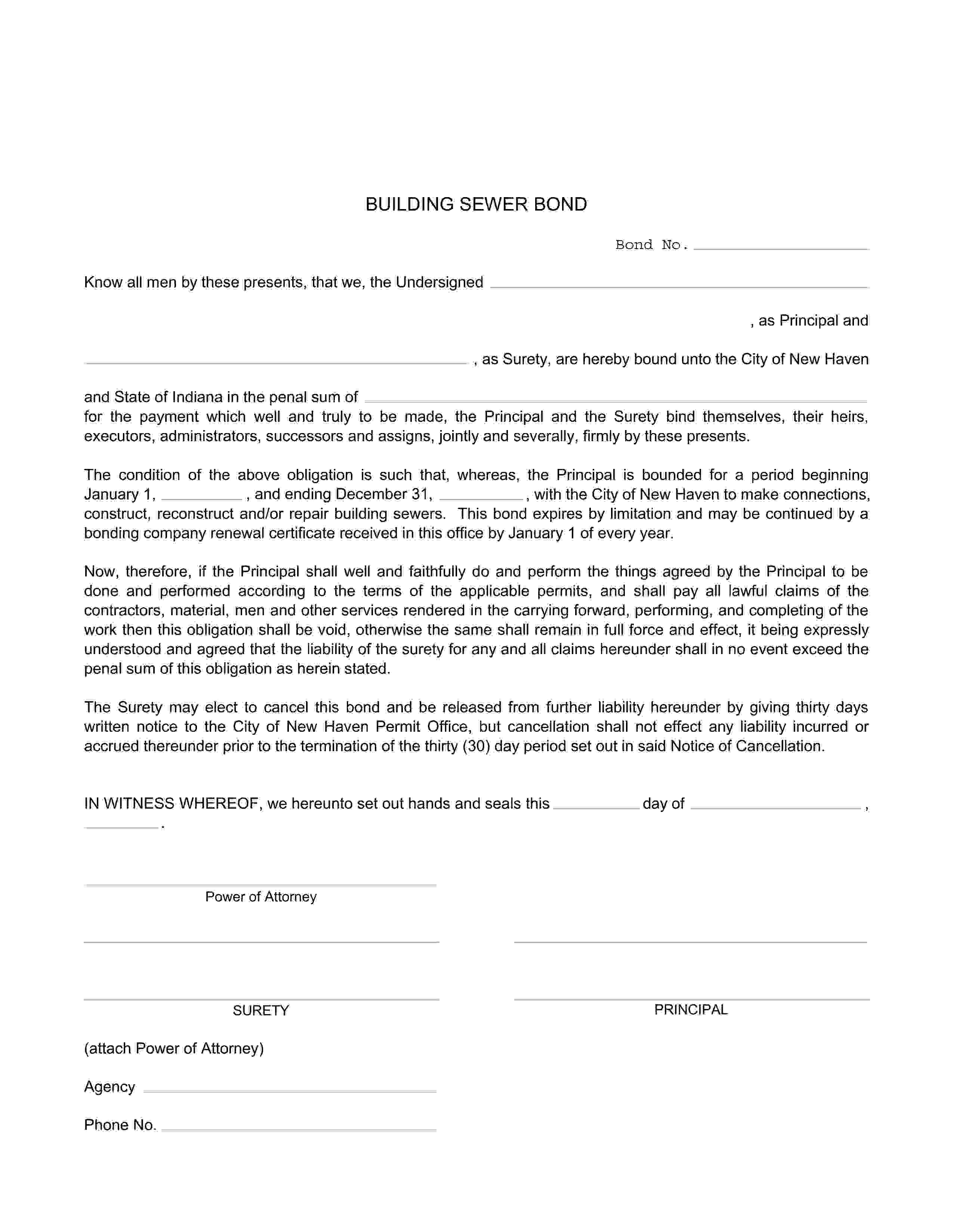 The Indiana City of New Haven Building Sewer Permit Bond starts at $250 plus shipping costs and fees. Fill out the form to buy your bond instantly!