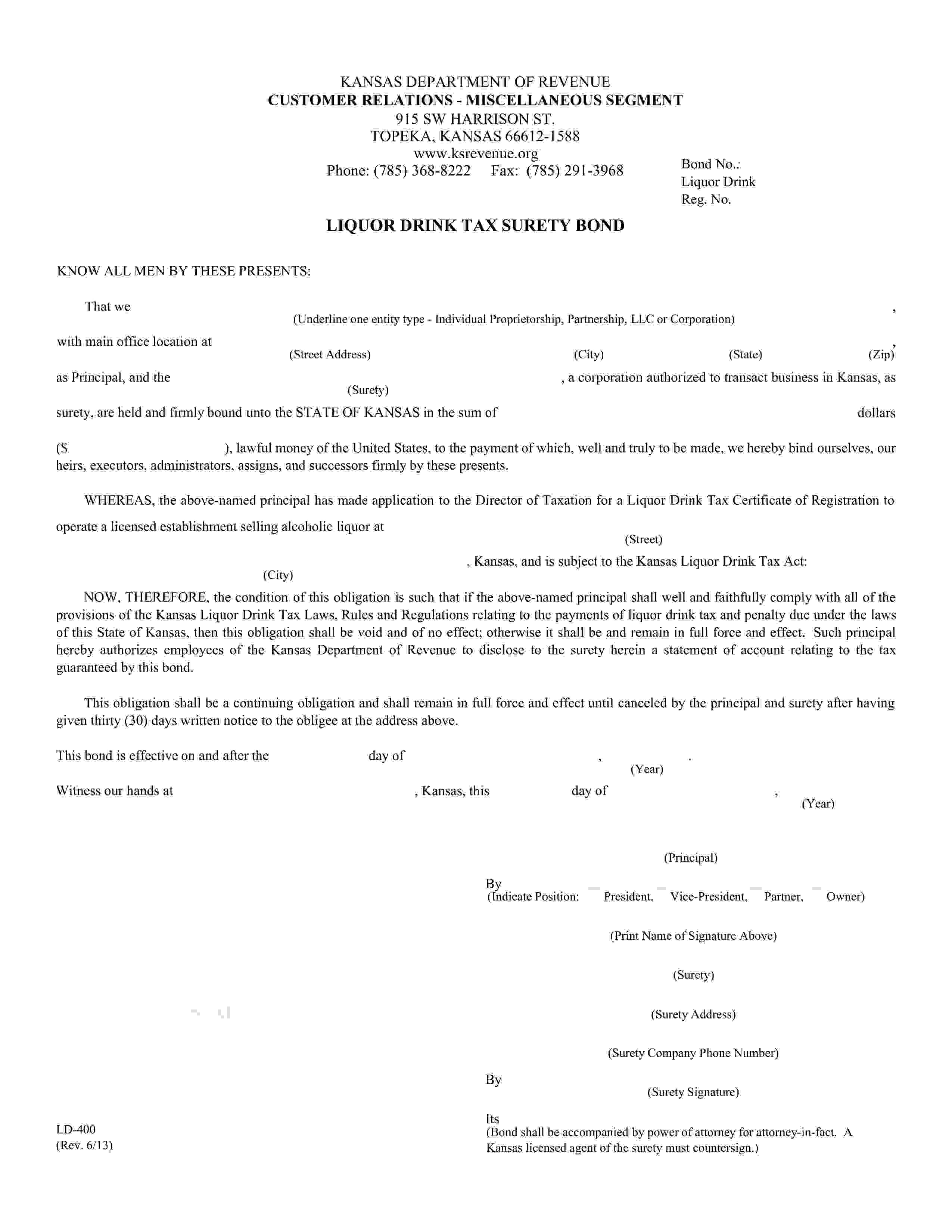 The Kansas Liquor Drink Tax Bond starts at $100 plus shipping costs and fees. Fill out the form to buy your bond instantly!