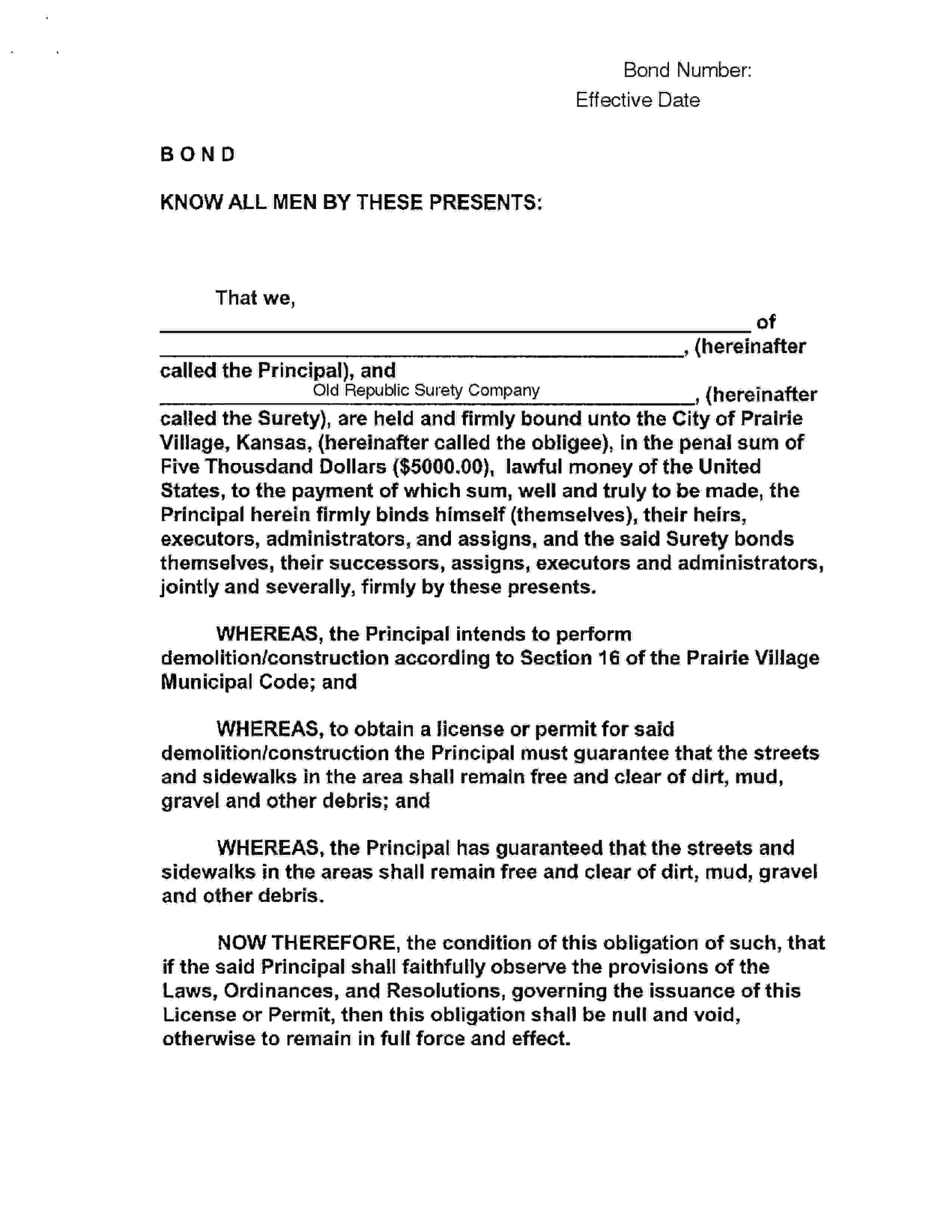 The Kansas Prairie Village - City Demolition Bond starts at $100 plus shipping costs and fees. Fill out the form to buy your bond instantly!