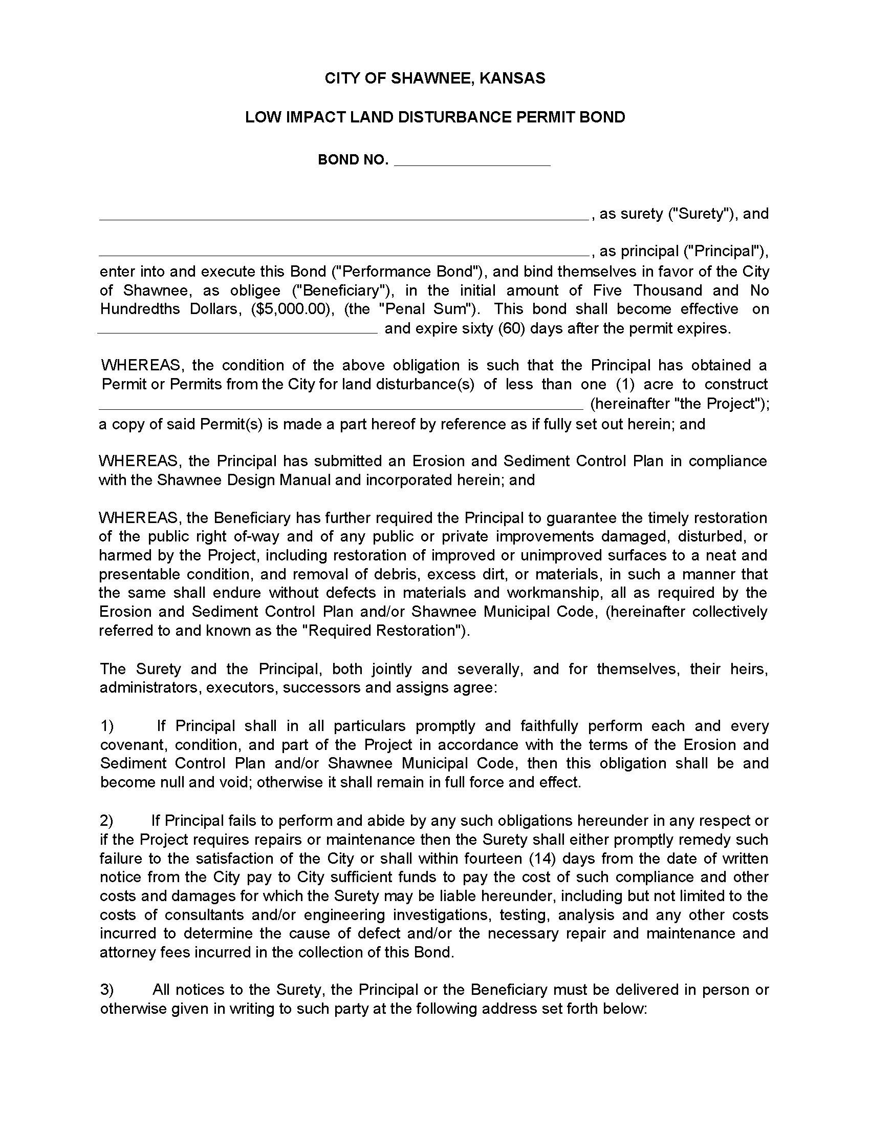 City of Shawnee Low Impact Land Disturbance Permit Bond