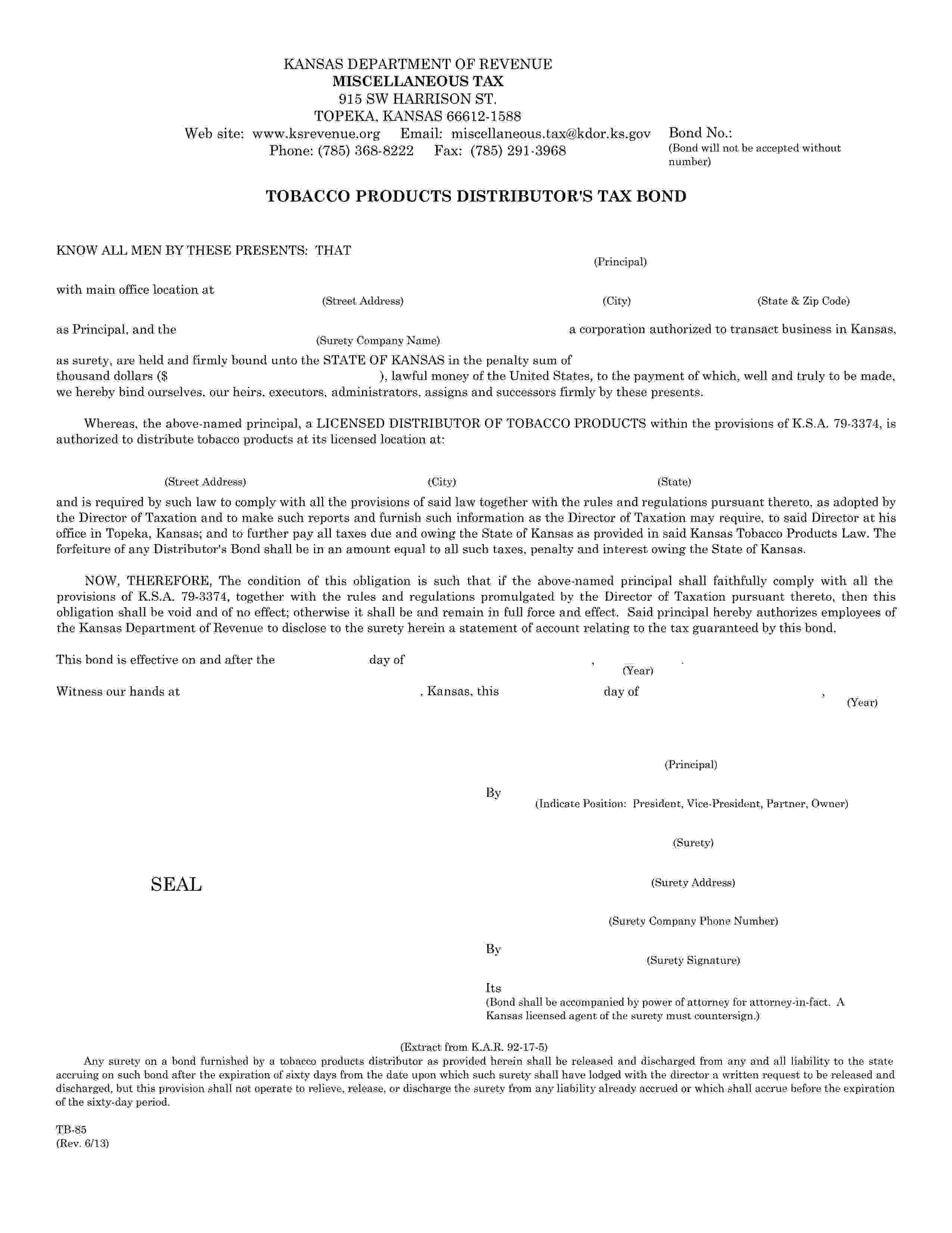 State of Kansas Tobacco Products Distributor's Tax Bond