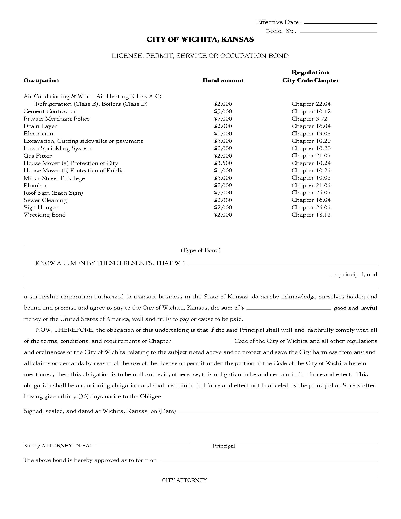 The Kansas City of Wichita Trade Contractor, License/Permit Bond starts at $100 plus shipping costs and fees. Fill out the form to buy your bond instantly!
