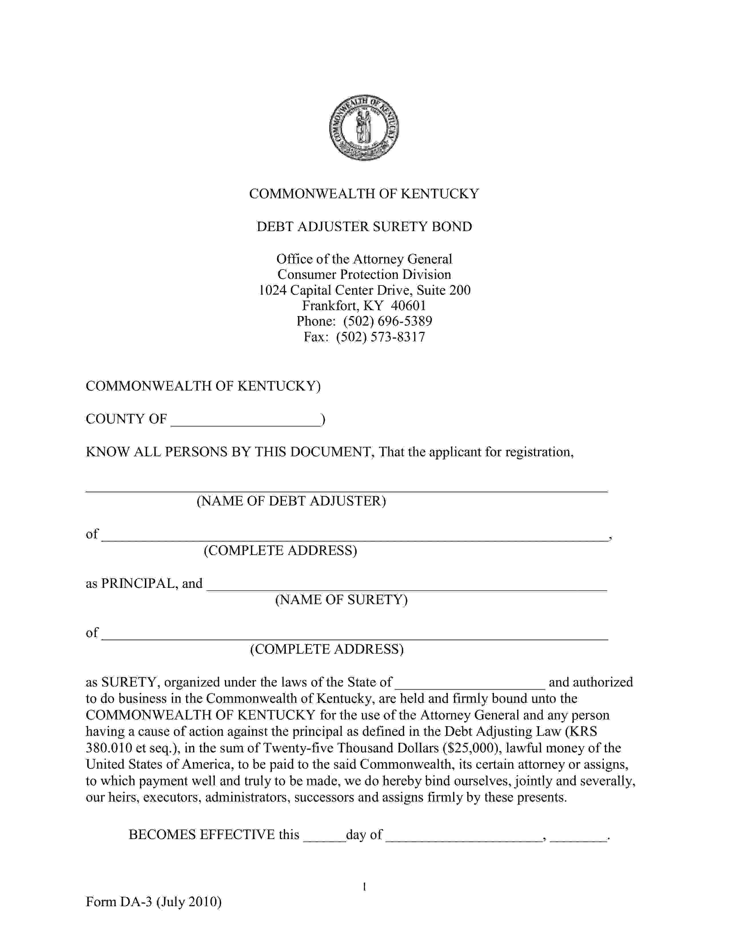 Kentucky Office of the Attorney General Debt Adjuster Bond