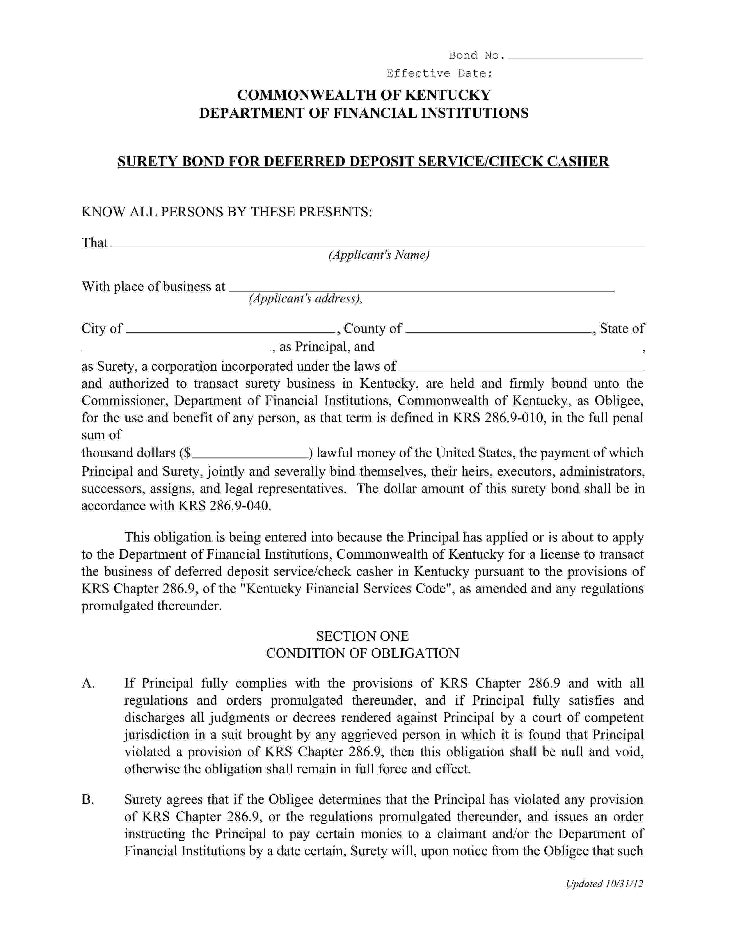 Commonwealth of Kentucky Deferred Deposit Service Business Bond