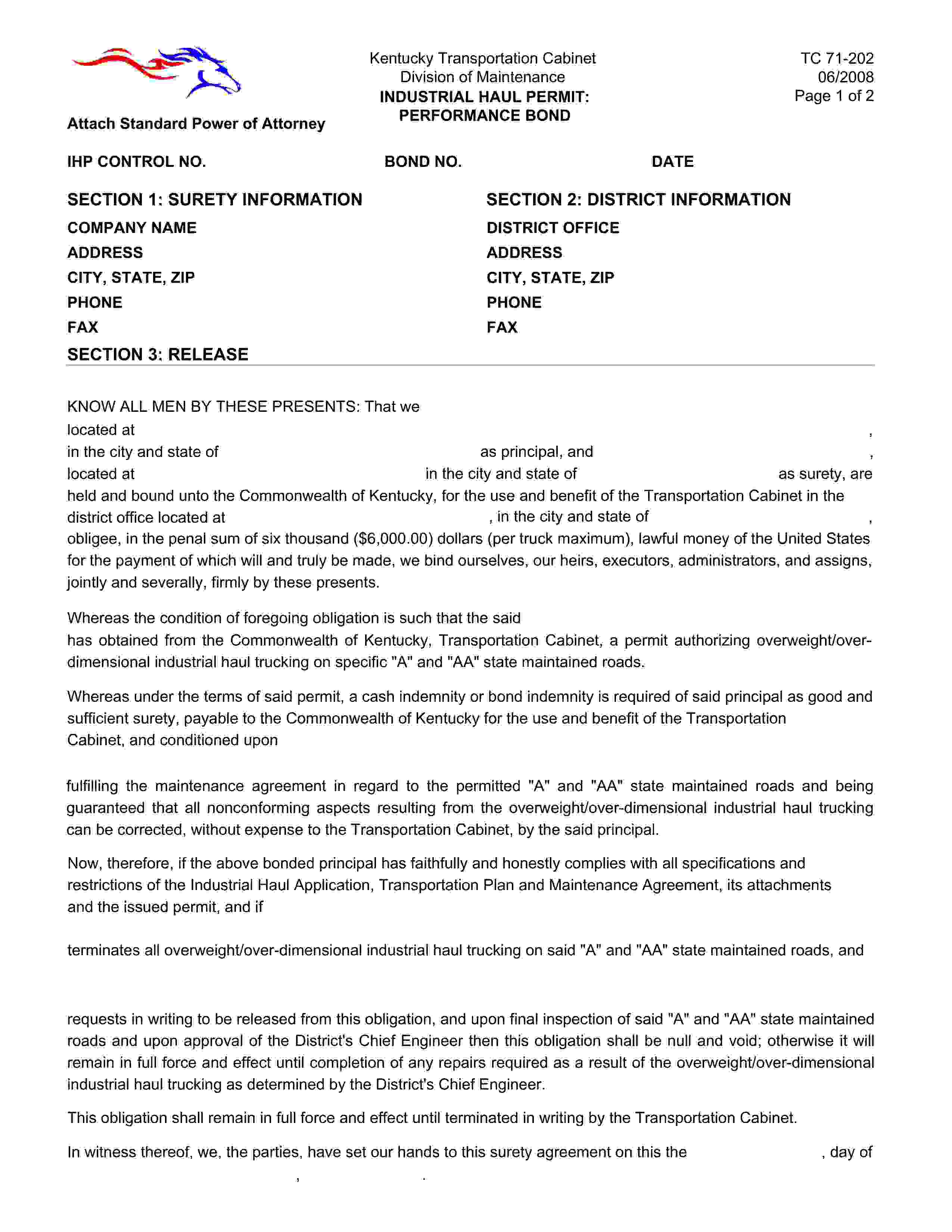 Kentucky Transportation Cabinet Industrial Haul Permit Bond