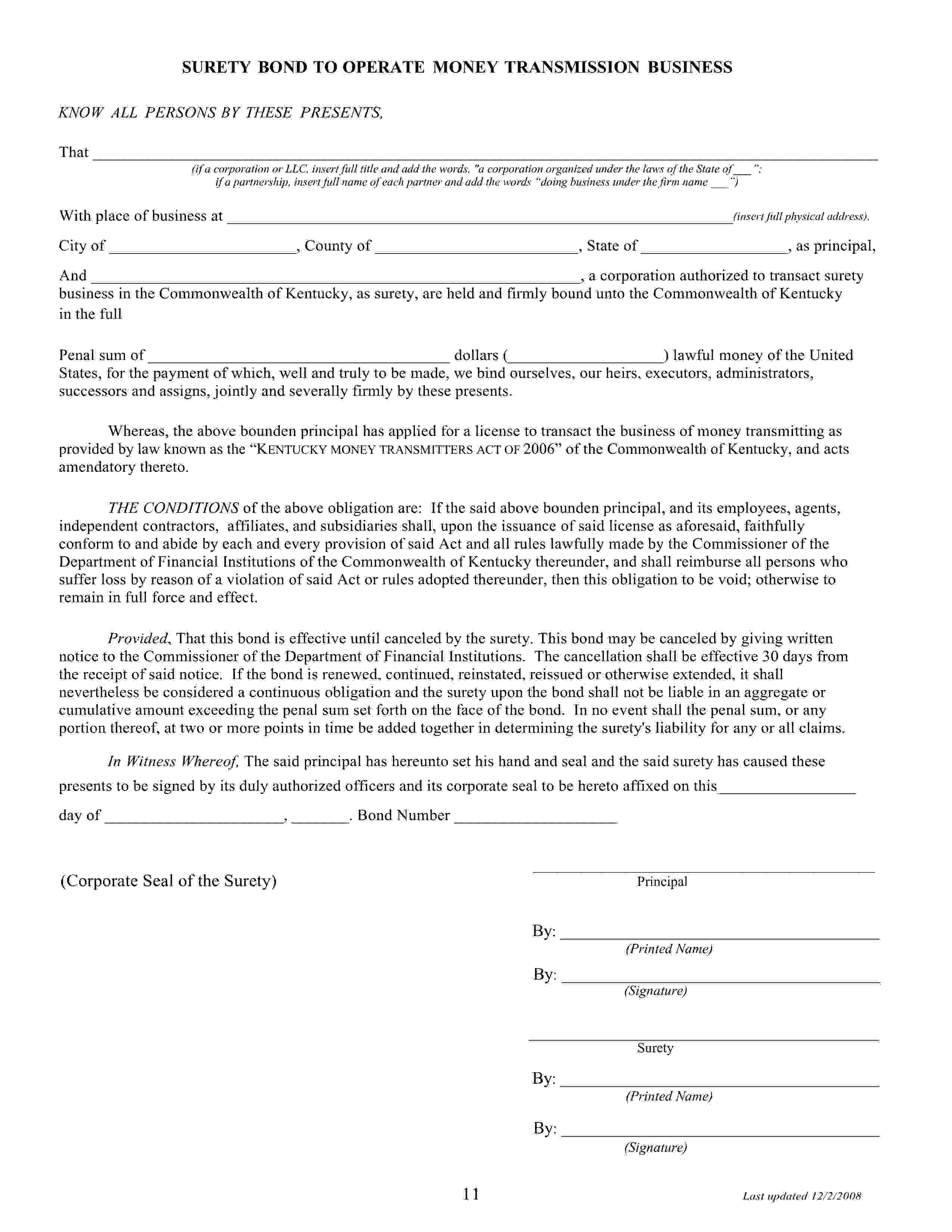 The Kentucky Money Transmitter License Bond starts at $5000 plus shipping costs and fees. Fill out the form to buy your bond instantly!
