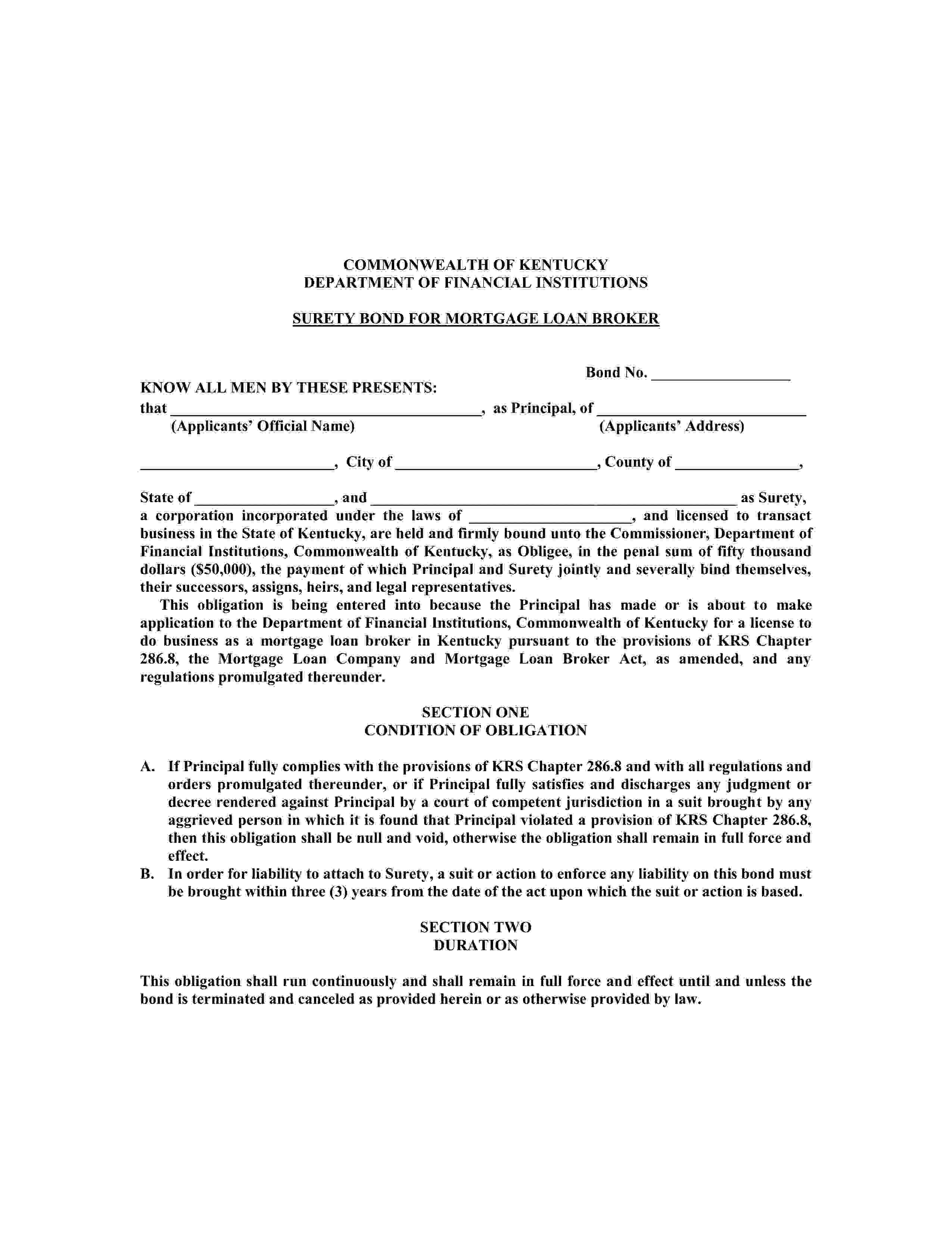 Commonwealth of Kentucky Mortgage Broker License Bond
