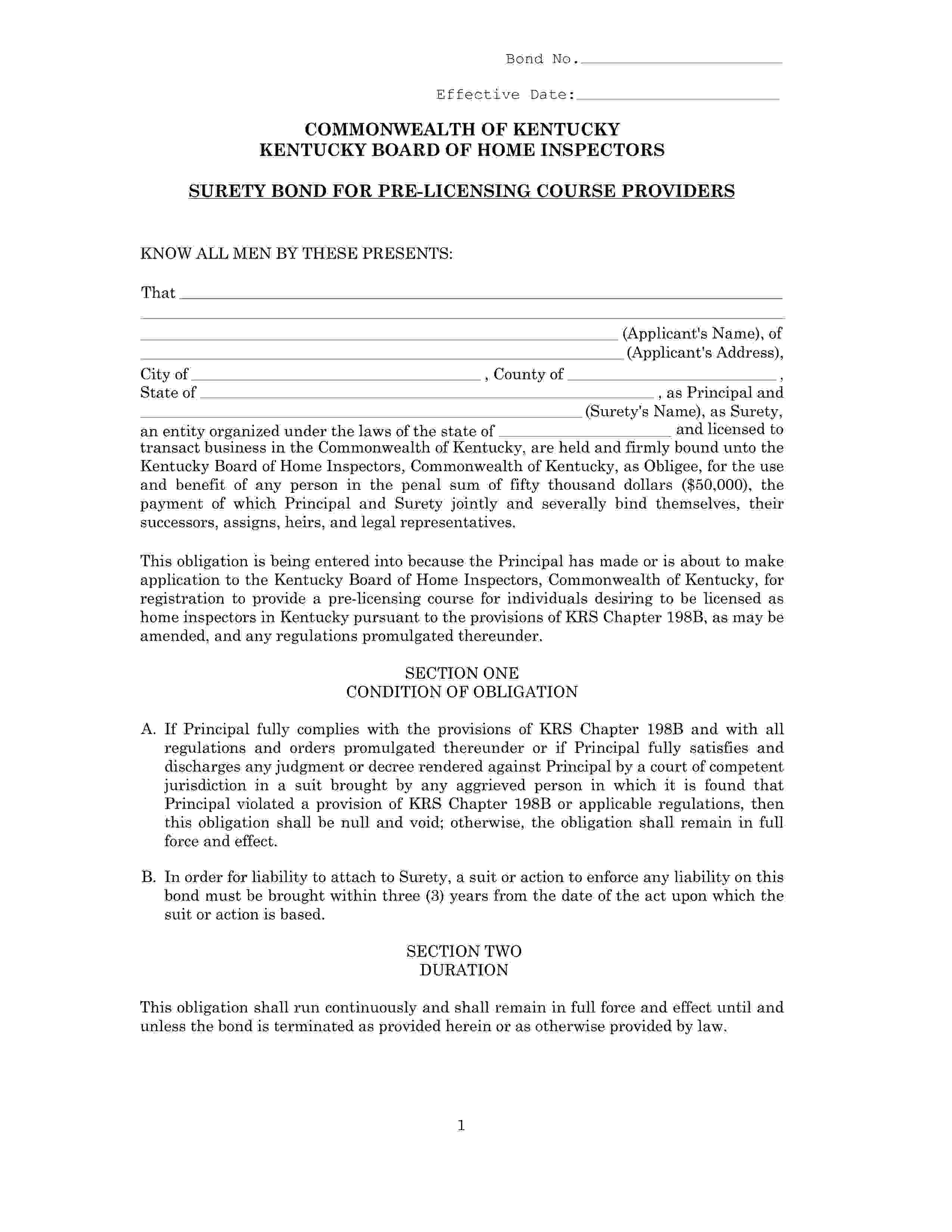 Kentucky Board of Home Inspectors Pre-Licensing Home Inspector Course Providers Bond