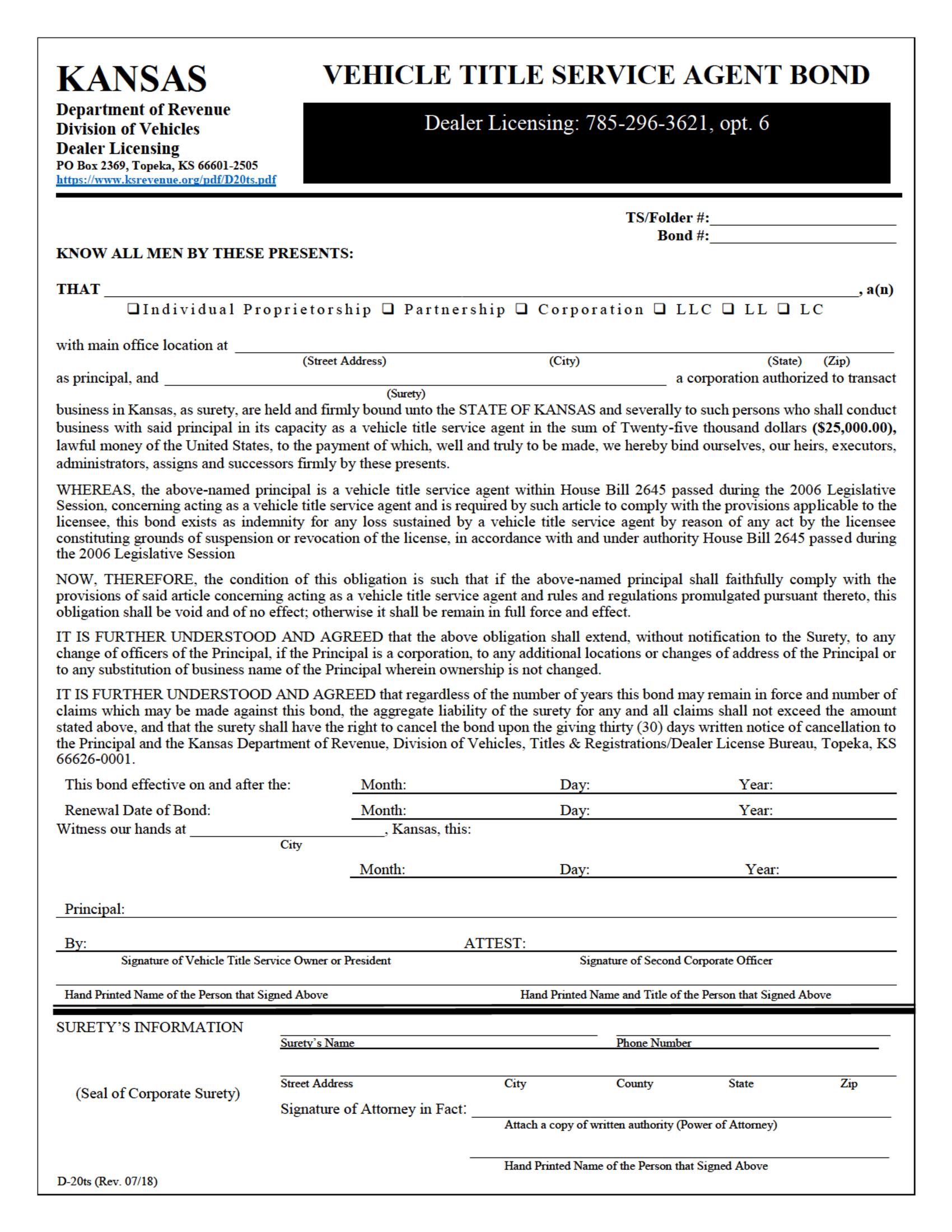 The Kansas Vehicle Title Service Agent Bond starts at $250 plus shipping costs and fees. Fill out the form to buy your bond instantly!