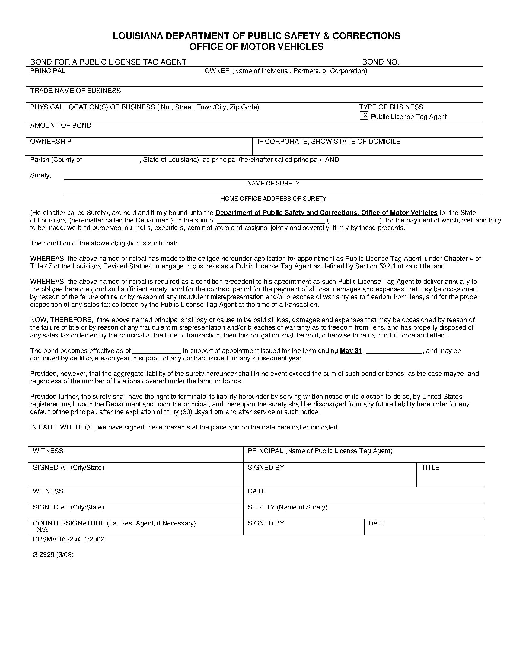 Department of Public Safety and Corrections, Office of Motor Vehicles Public License Tag Agent Bond
