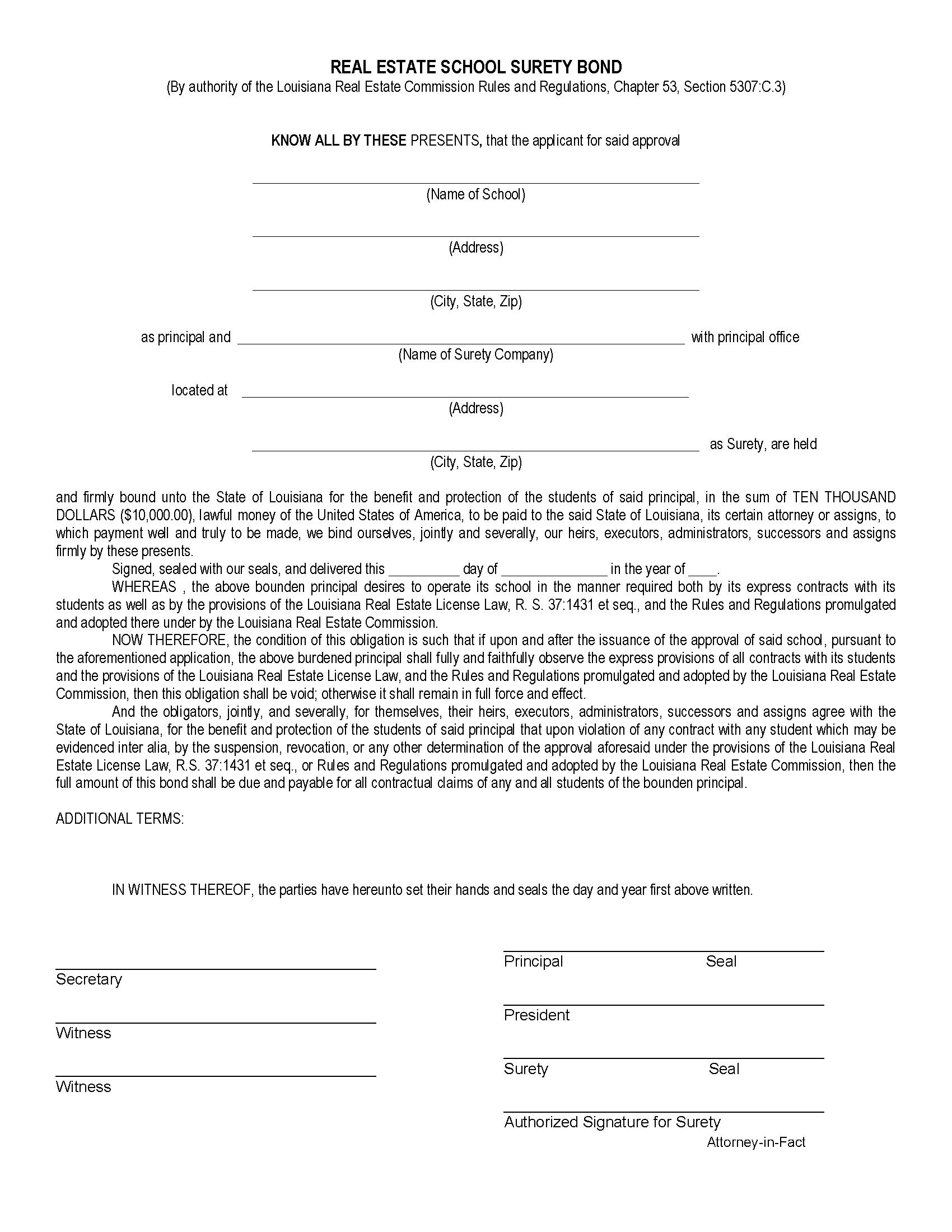 The Louisiana Real Estate School Bond starts at $100 plus shipping costs and fees. Fill out the form to buy your bond instantly!