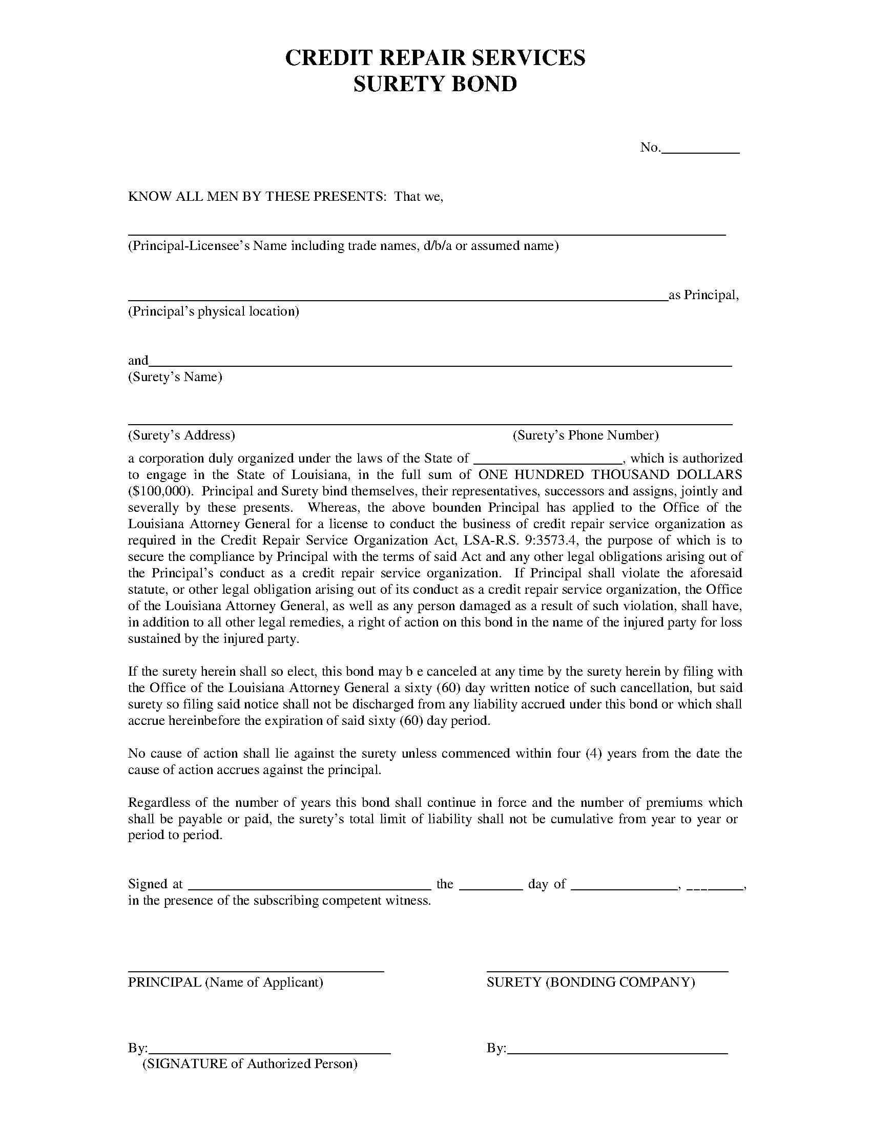 The Louisiana Credit Repair Services Organization Bond starts at $1000 plus shipping costs and fees. Fill out the form to buy your bond instantly!