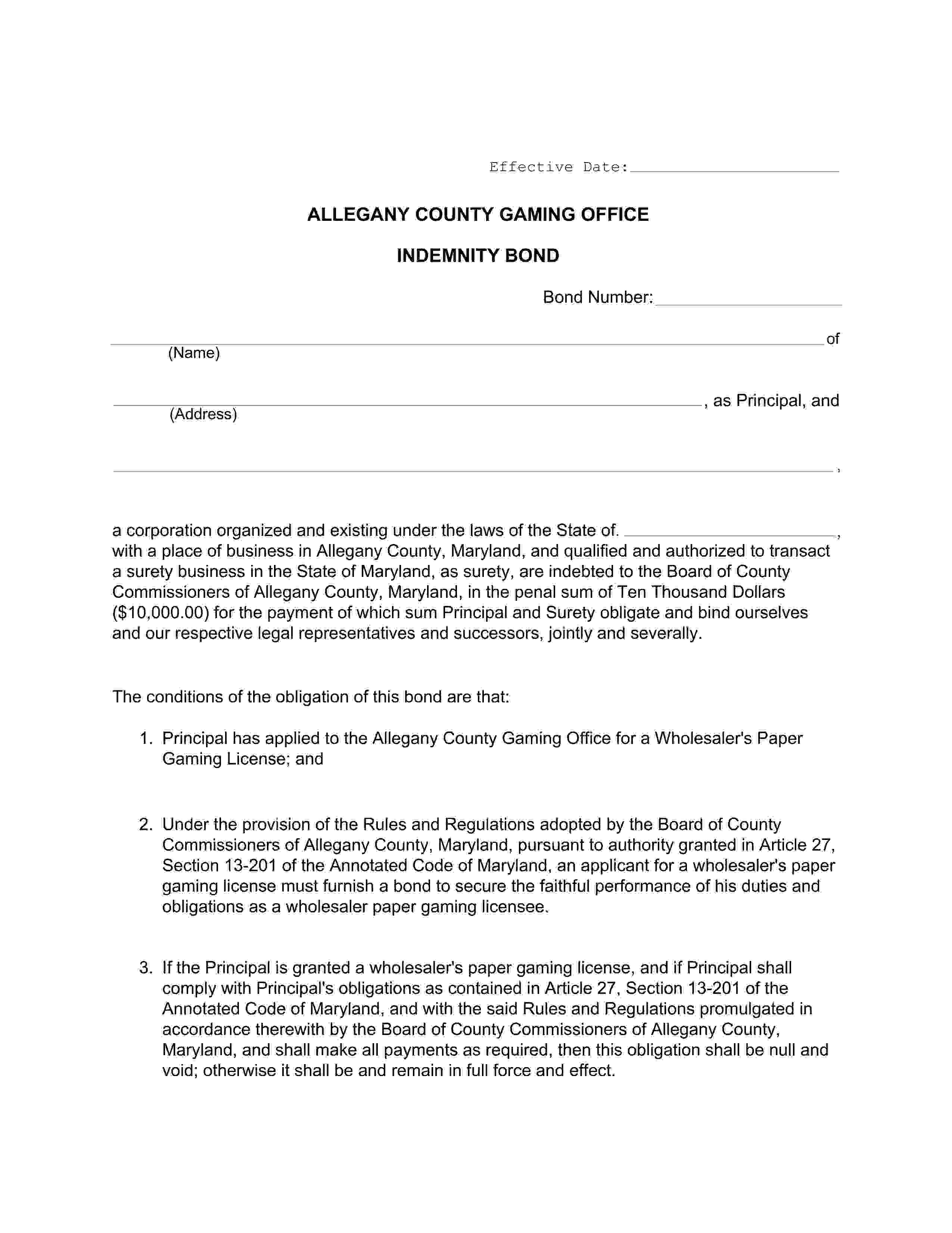 The Maryland Allegany County Wholesaler's Paper Gaming License Bond starts at $100 plus shipping costs and fees. Fill out the form to buy your bond instantly!