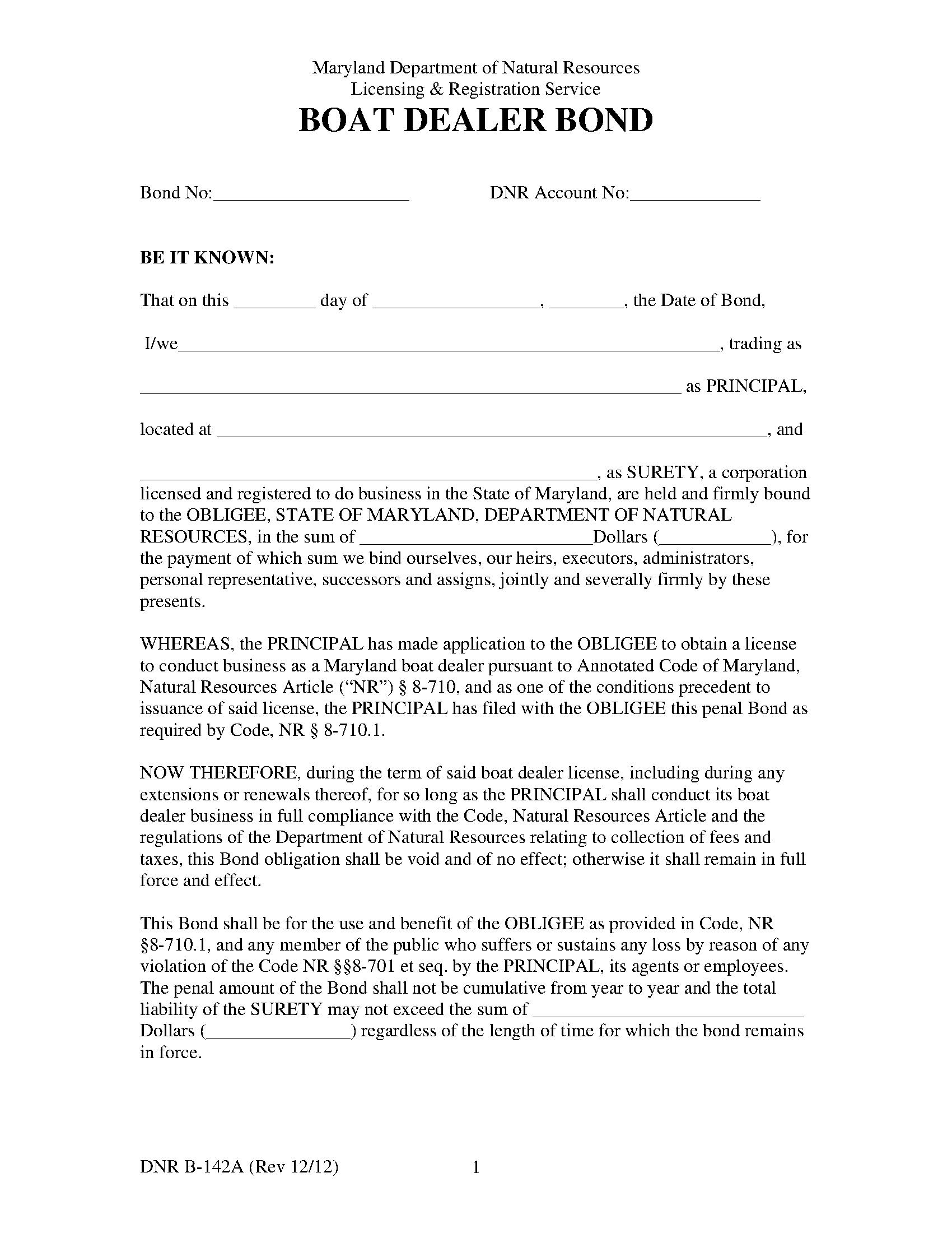 Maryland Department of Natural Resources Boat Dealer Bond
