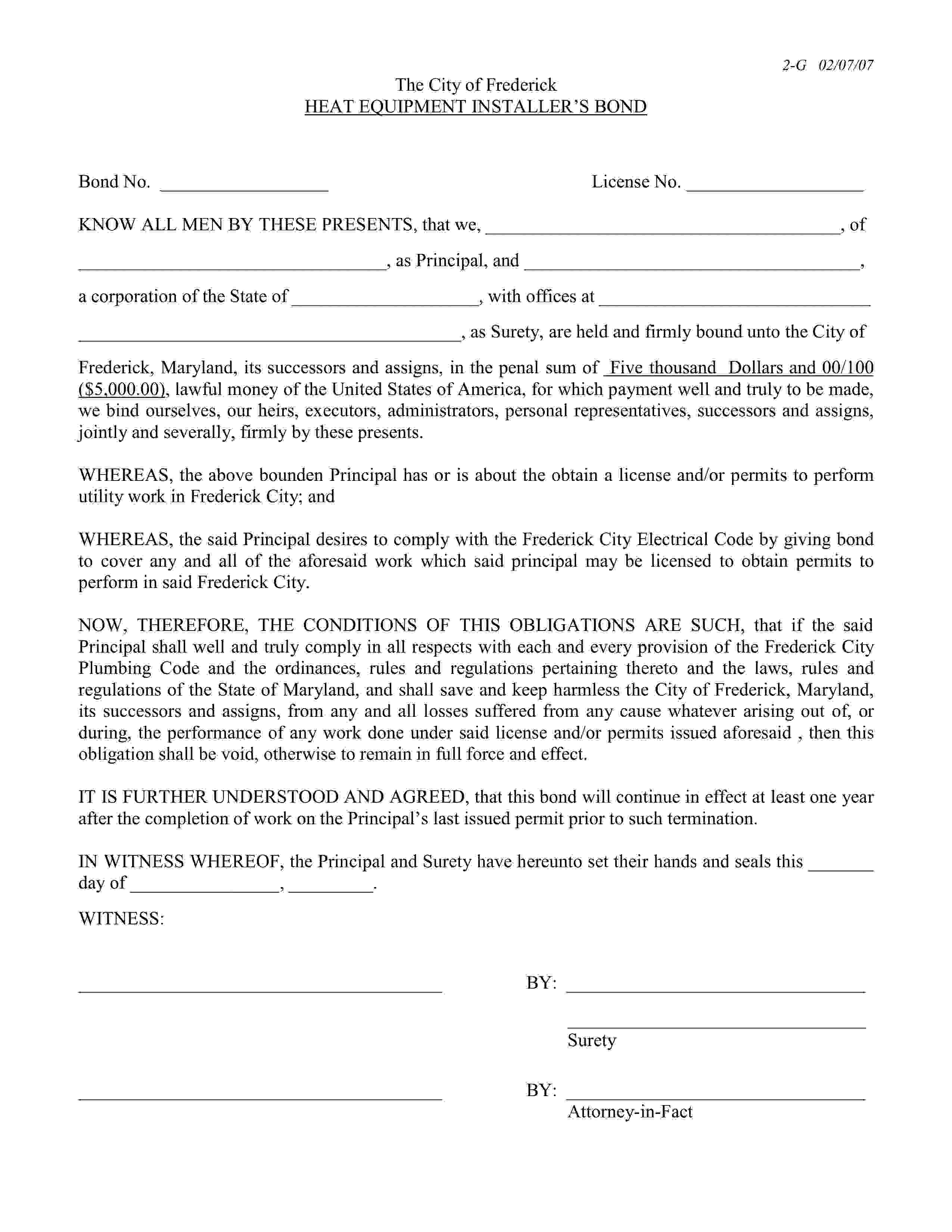 The Maryland City of Frederick Heat Equipment Installer Bond starts at $100 plus shipping costs and fees. Fill out the form to buy your bond instantly!