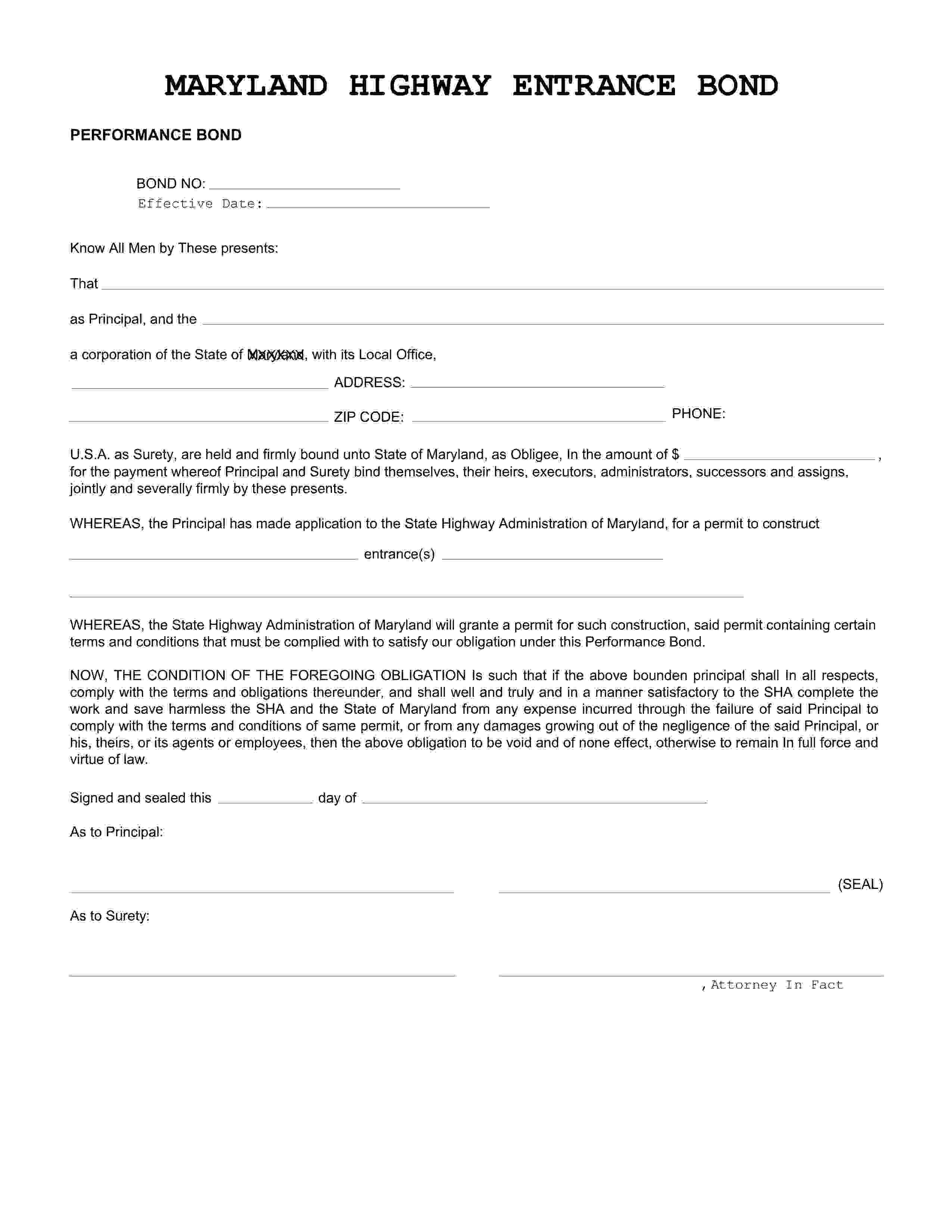 The Maryland Highway Entrance Bond starts at $100 plus shipping costs and fees. Fill out the form to buy your bond instantly!