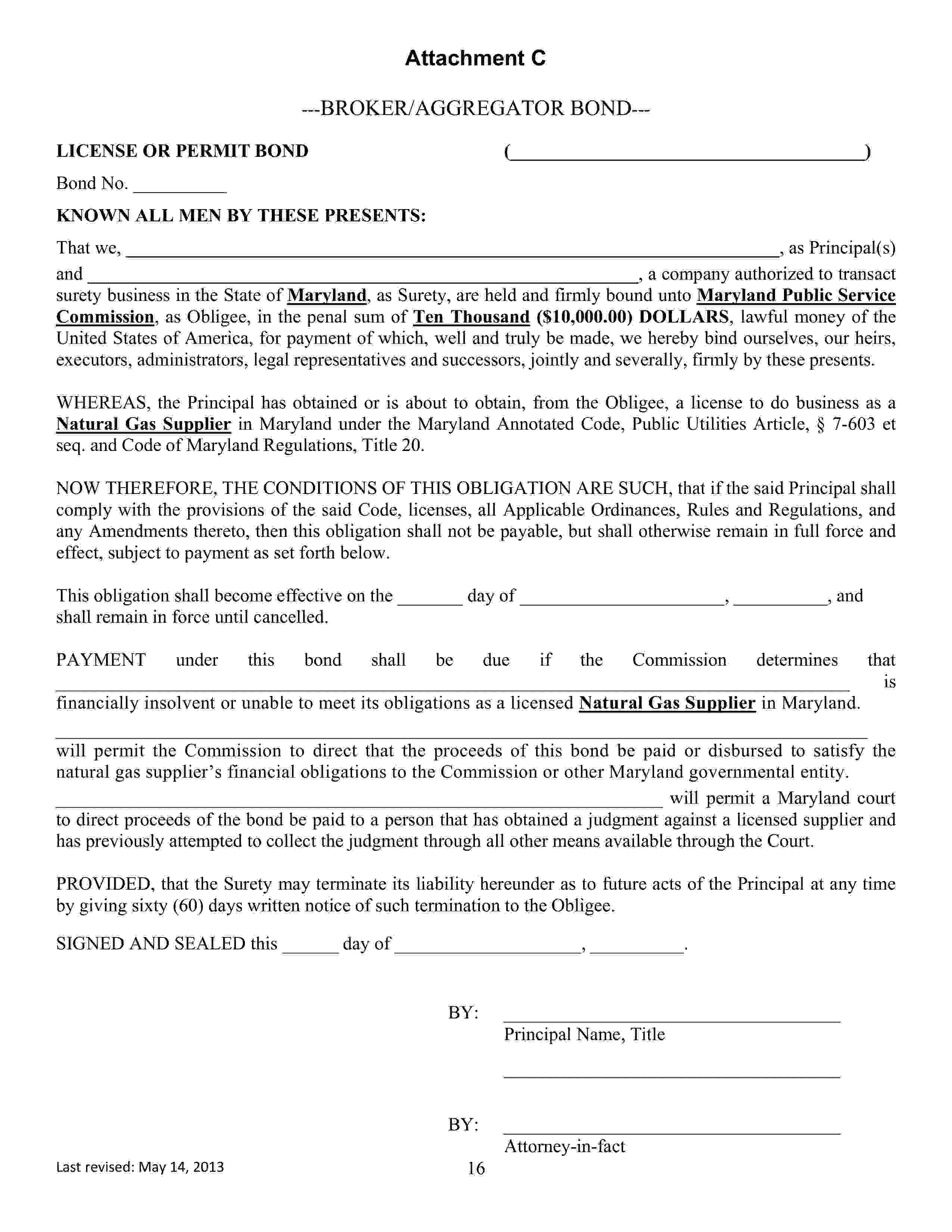 State of Maryland Natural Gas Supplier Broker/Aggregator Bond