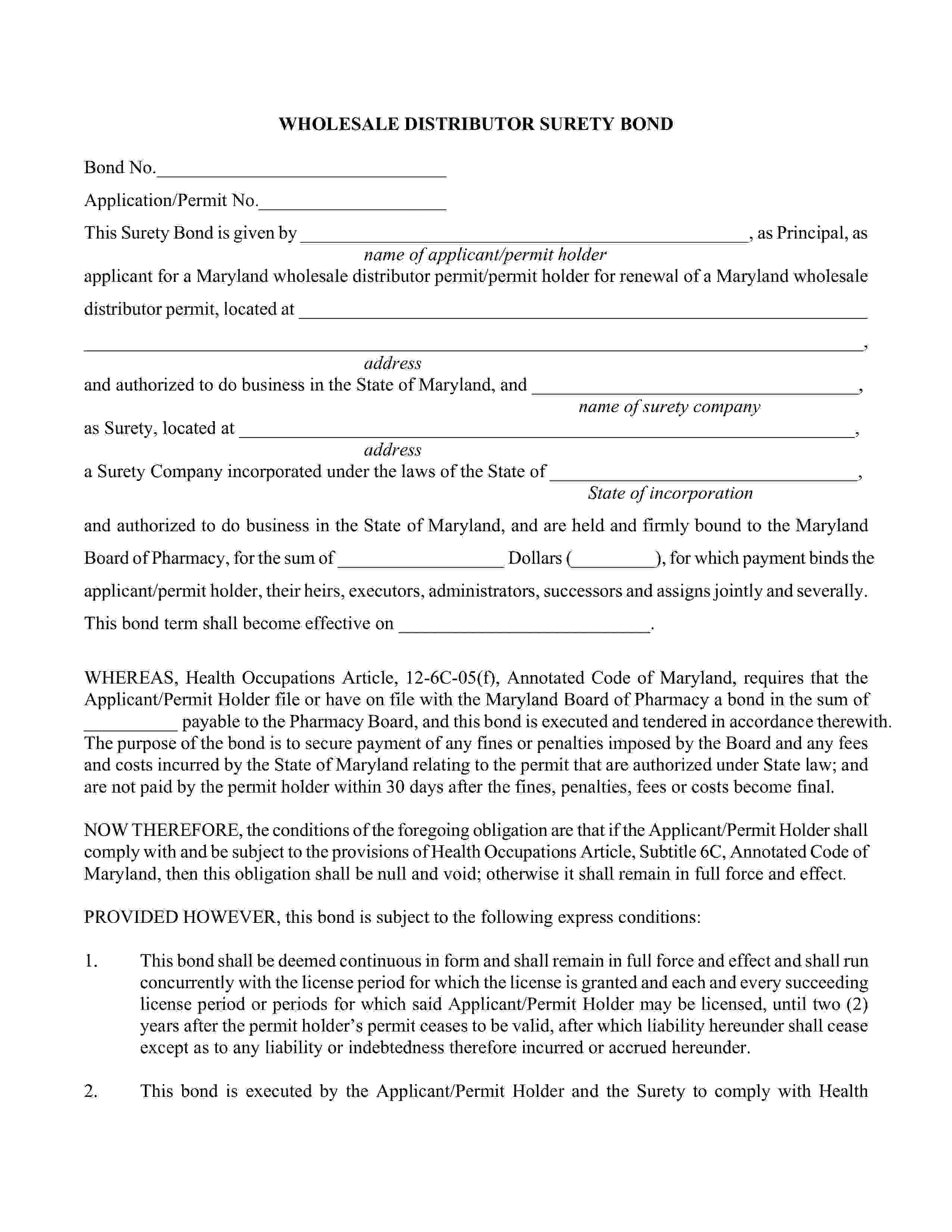 State of Maryland Prescription Drug Wholesale Distributor Bond