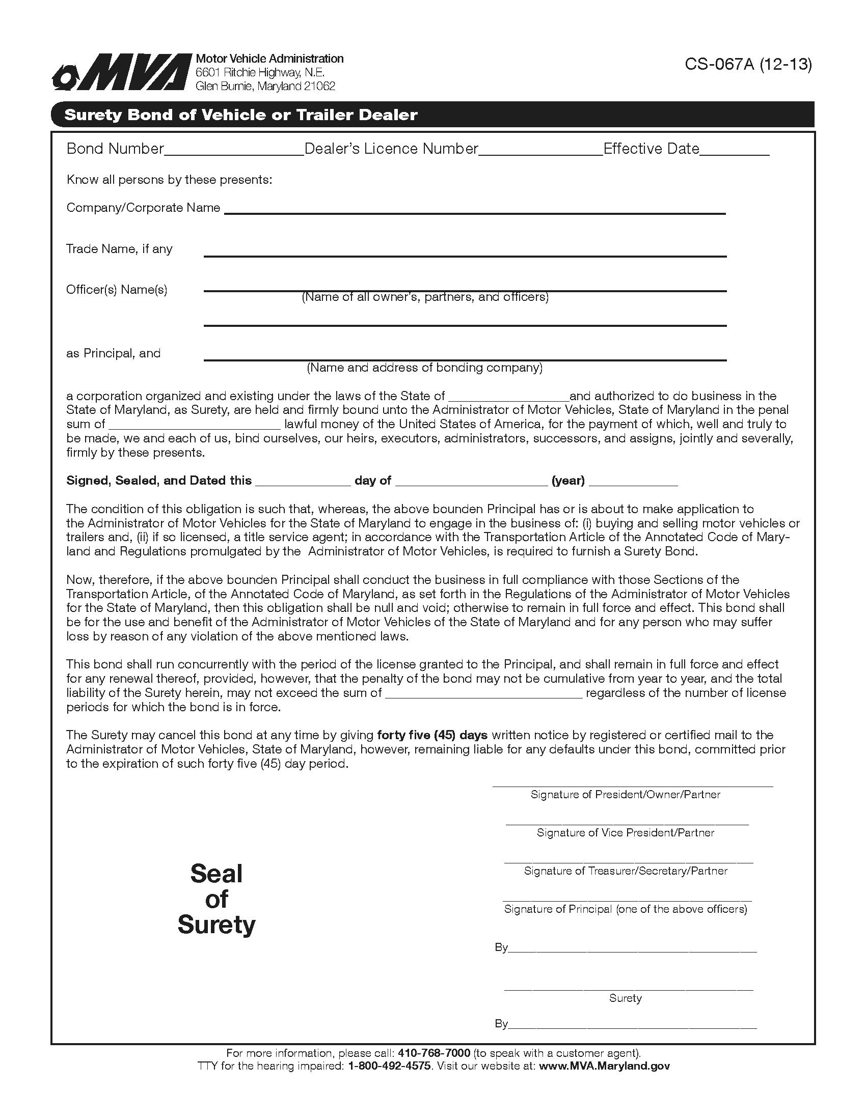 The Maryland Used Motor Vehicle or Trailer Dealer Bond is required as part of the license application process for Maryland Dealer Licenses.