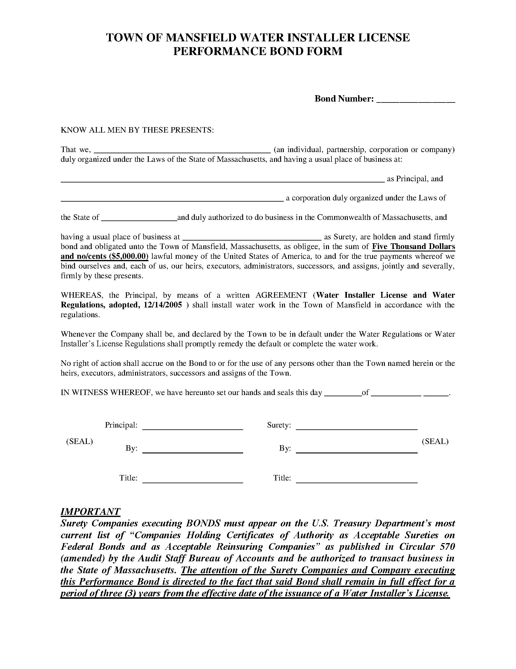 Town of Mansfield Water Installer Bond
