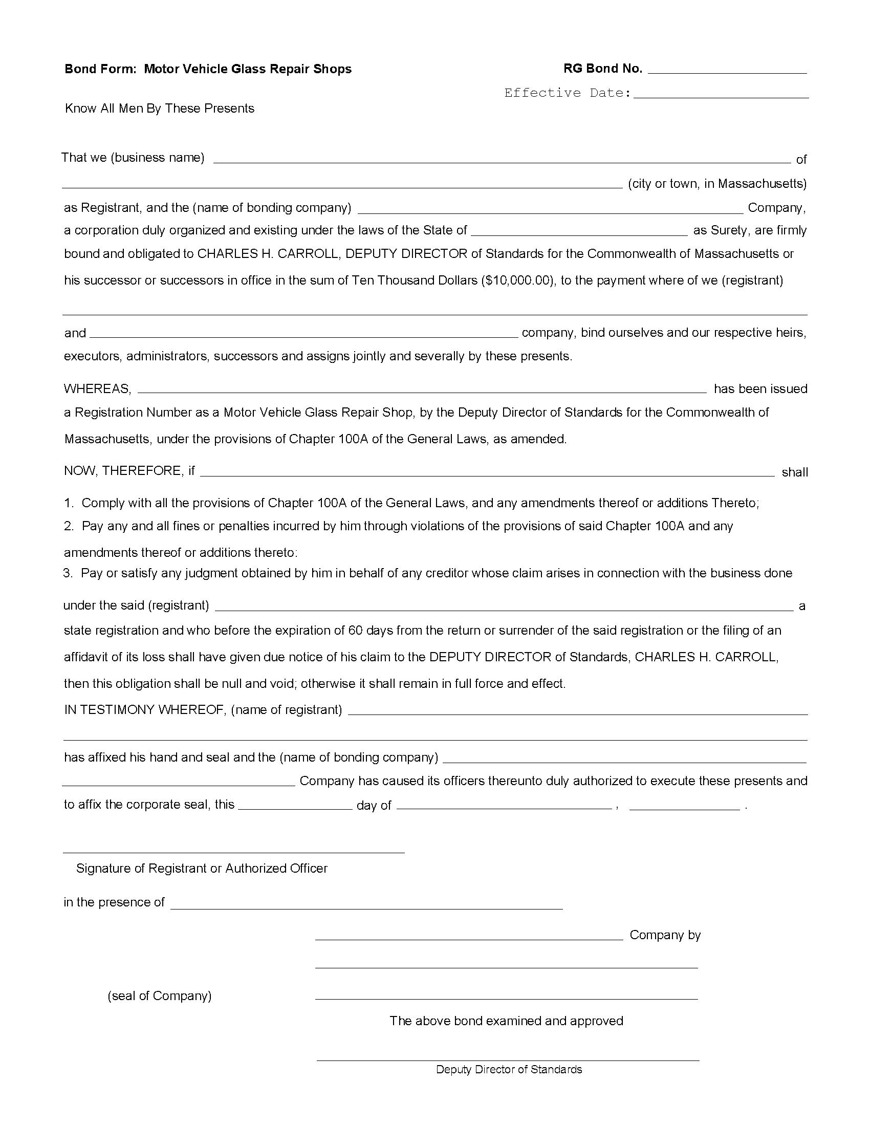 Commonwealth of Massachusetts Motor Vehicle Glass Repair Shop Bond