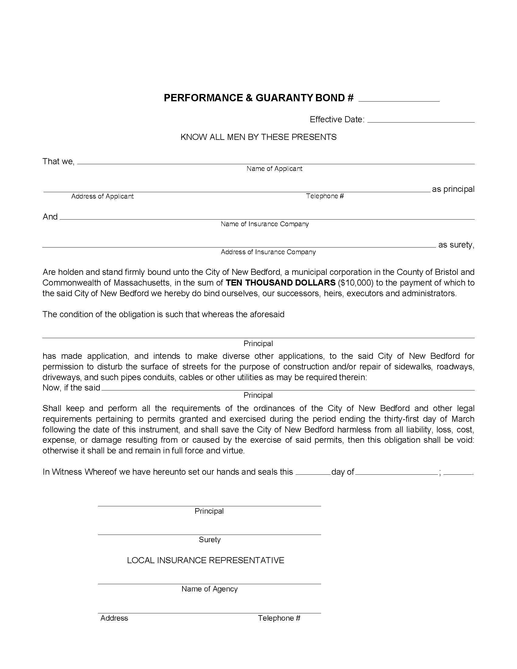 The Massachusetts New Bedford Performance & Guaranty Bond starts at $100 plus shipping costs and fees. Fill out the form to buy your bond instantly!