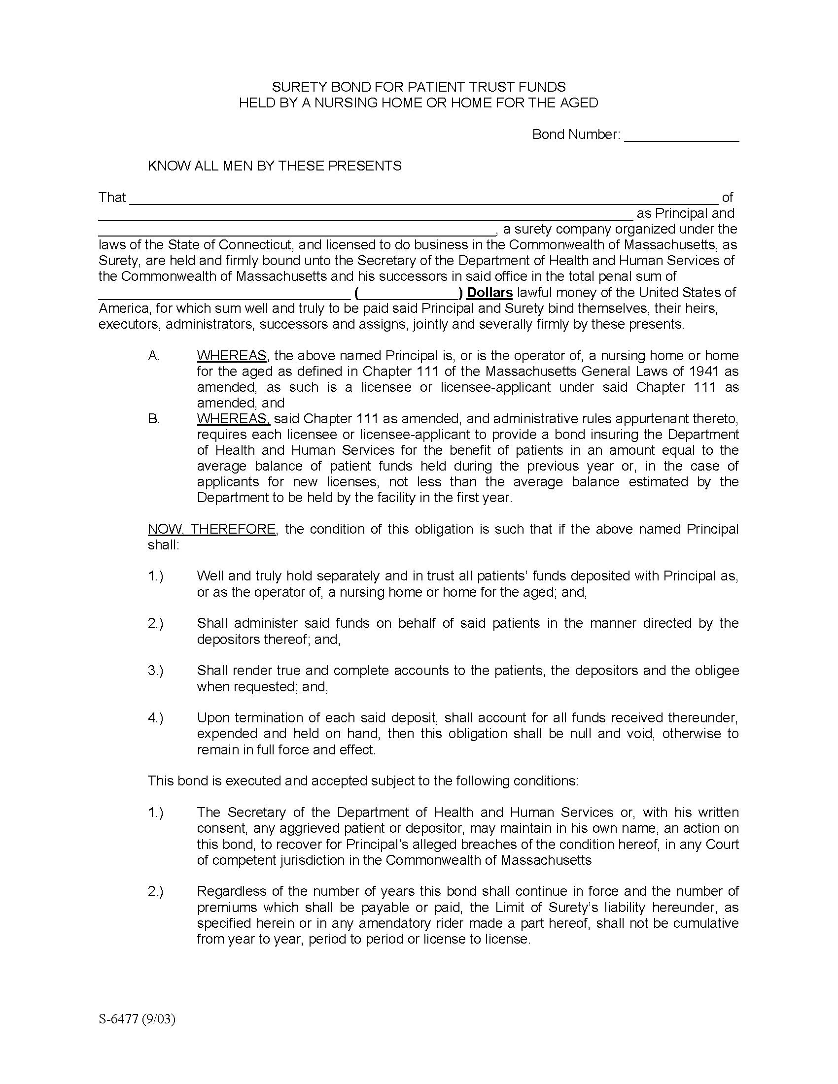 Fill out the form to buy your Massachusetts Nursing Home - Patient Trust Fund Bond instantly!