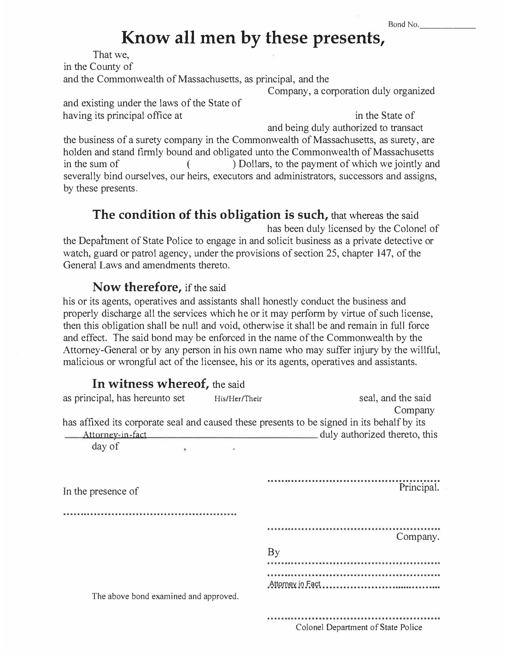 Commonwealth of Massachusetts Private Detective or Watch, Guard or Patrol Agency Bond