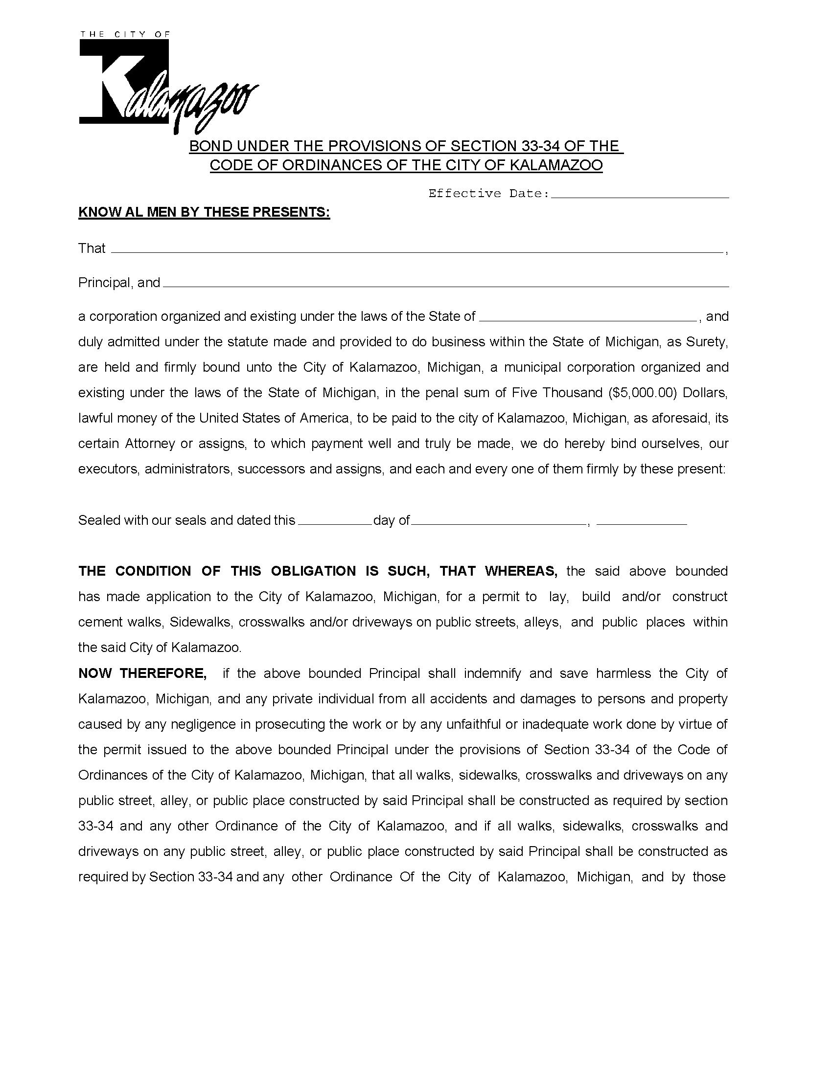 City of Kalamazoo Sidewalk Contractor Bond