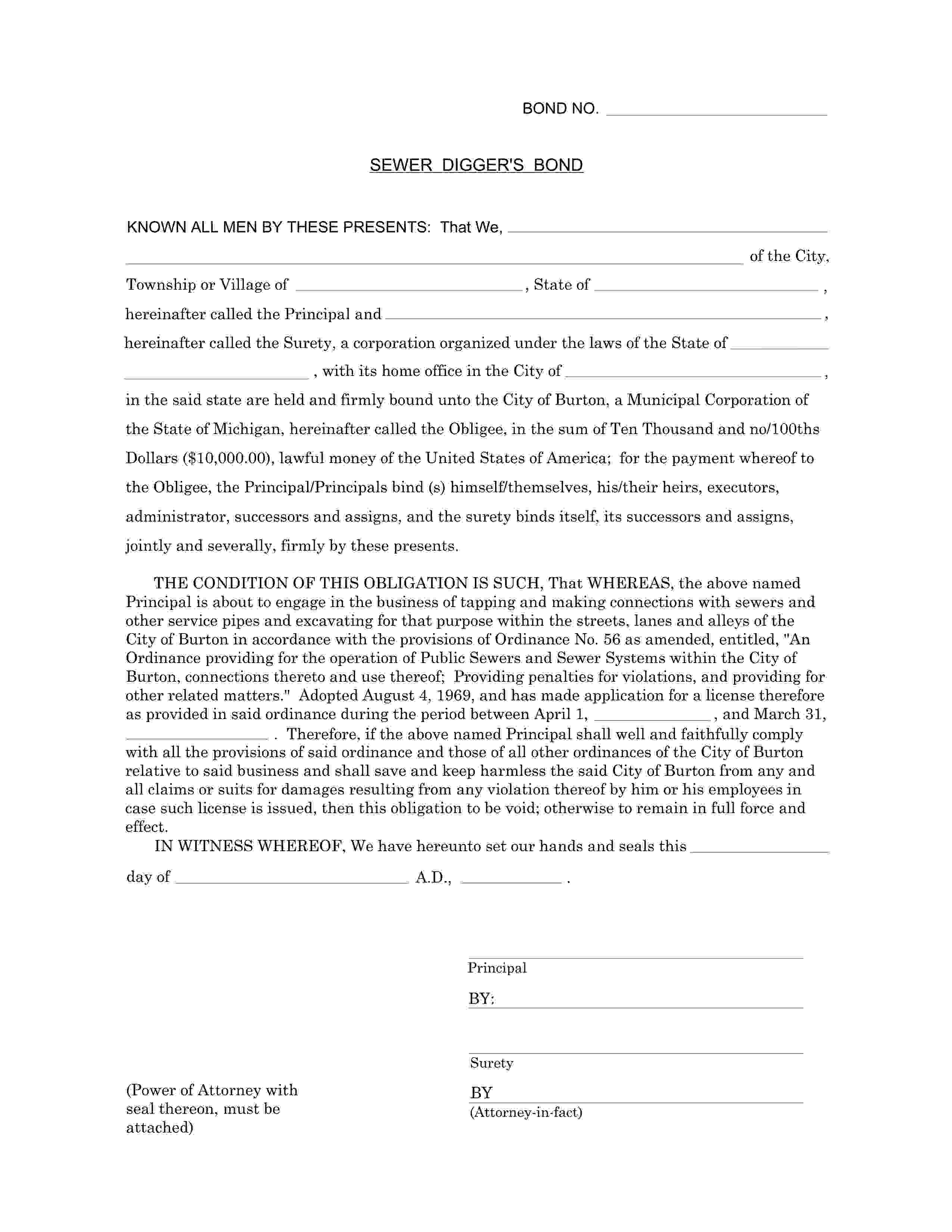 The Michigan Burton - City Sewer Digger Bond starts at $100 plus shipping costs and fees. Fill out the form to buy your bond instantly!