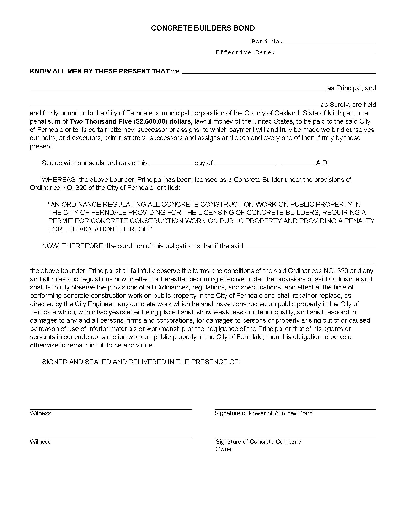 The Michigan City of Ferndale Concrete Builder Bond starts at $100 plus shipping costs and fees. Fill out the form to buy your bond instantly!
