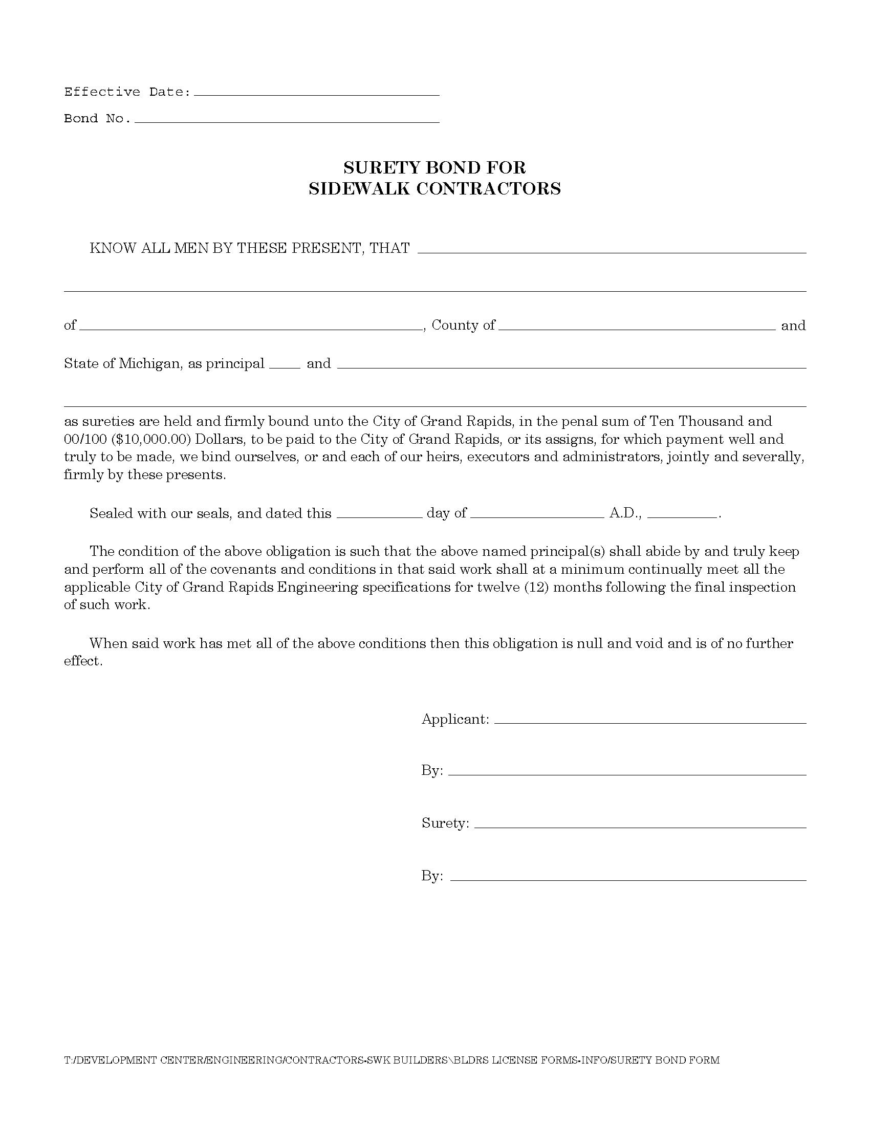 The Michigan City of Grand Rapids Sidewalk Contractor Bond starts at $100 plus shipping costs and fees. Fill out the form to buy your bond instantly!