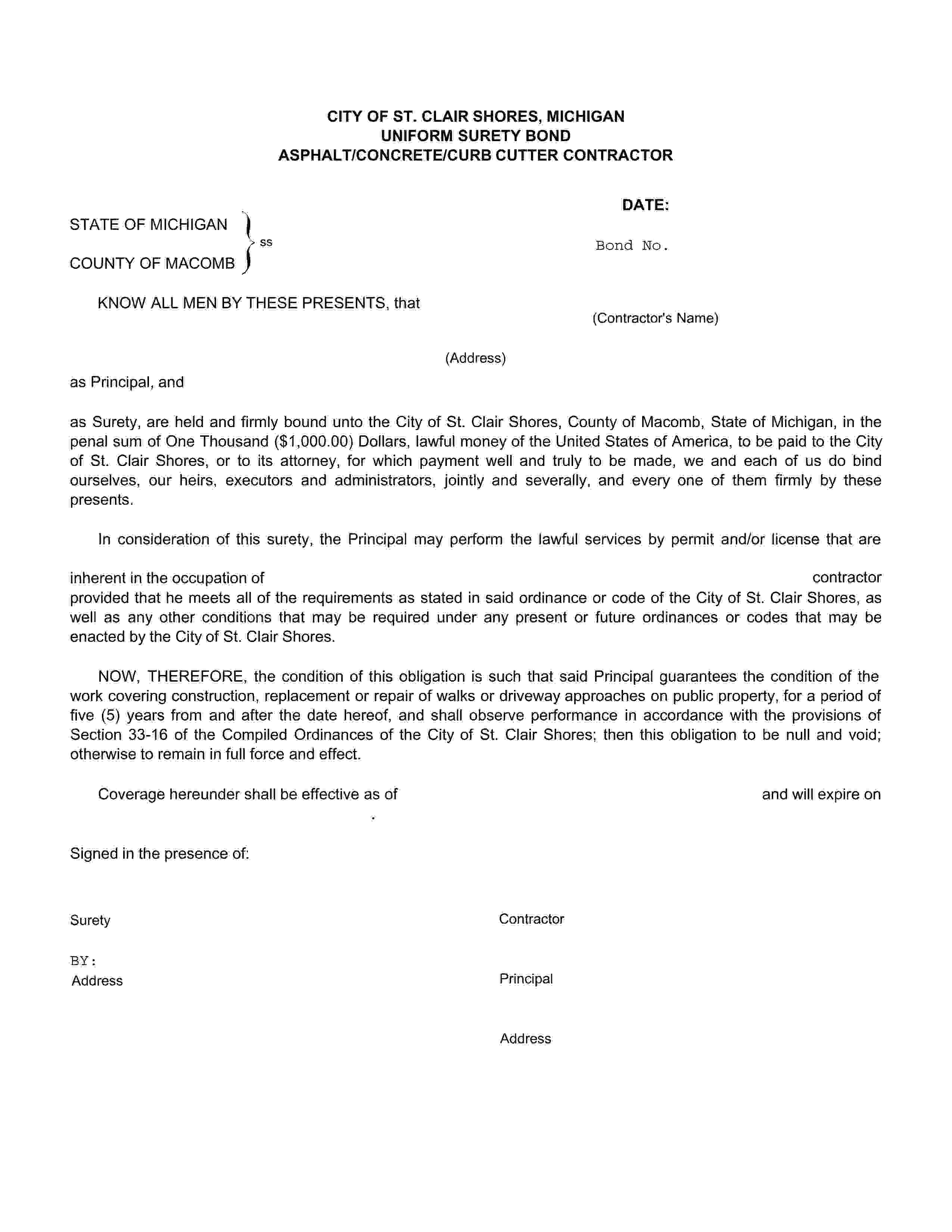 City of St. Clair Shores Asphalt/Concrete/Curb Cutter Contractor Bond