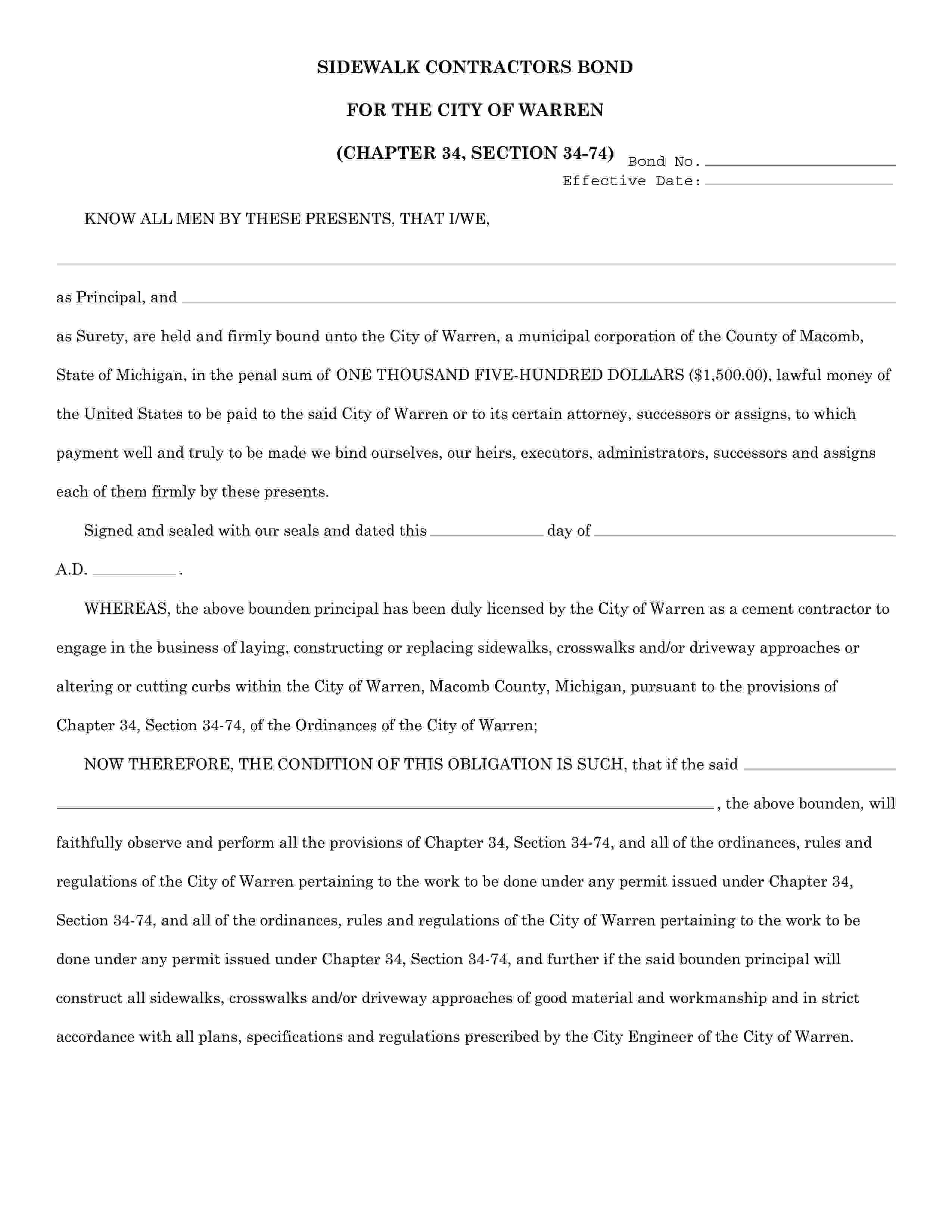The Michigan Warren - City Sidewalk Contractor Bond starts at $104 plus shipping costs and fees. Fill out the form to buy your bond instantly!
