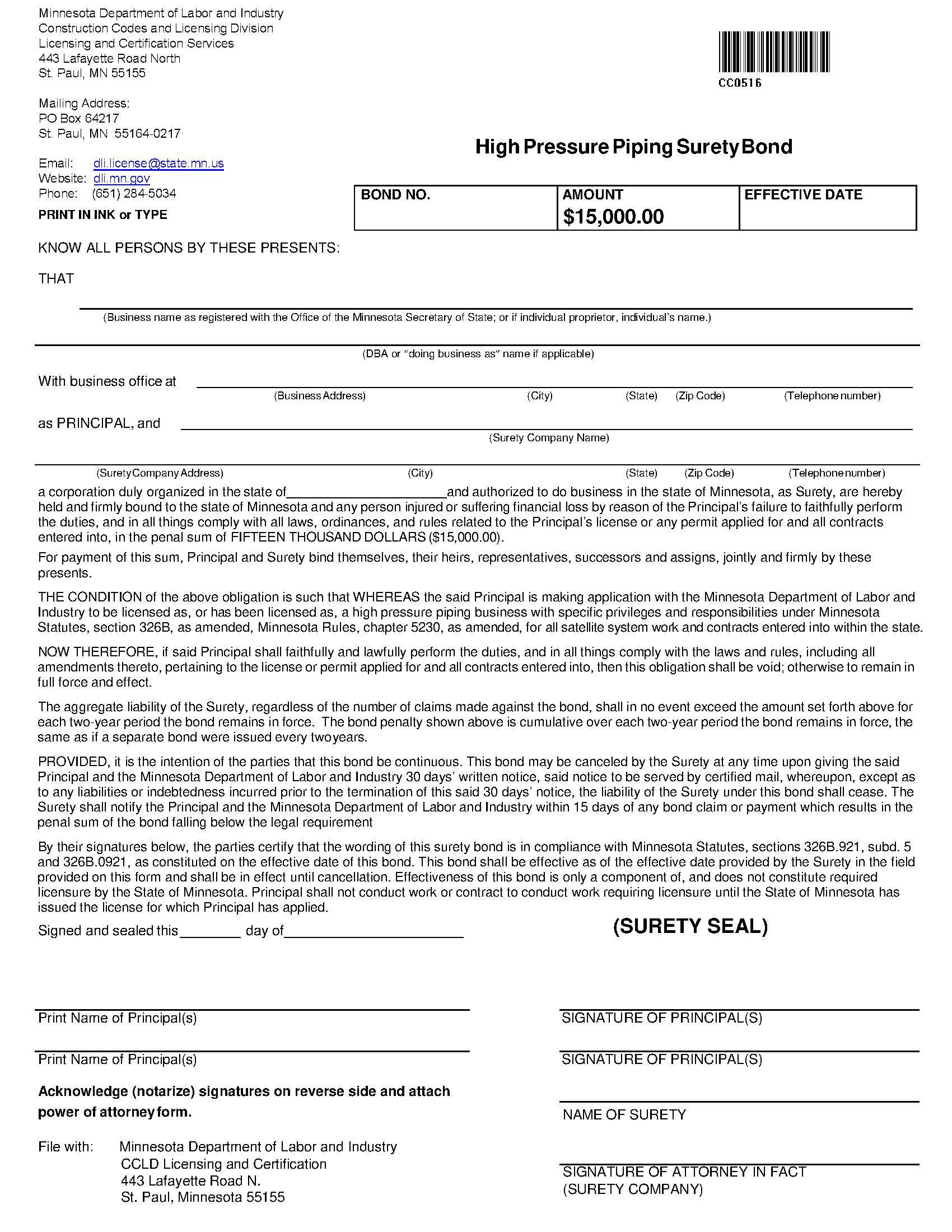 The Minnesota Contractor High Pressure Piping Bond starts at $172 plus shipping costs and fees. Fill out the form to buy your bond instantly!