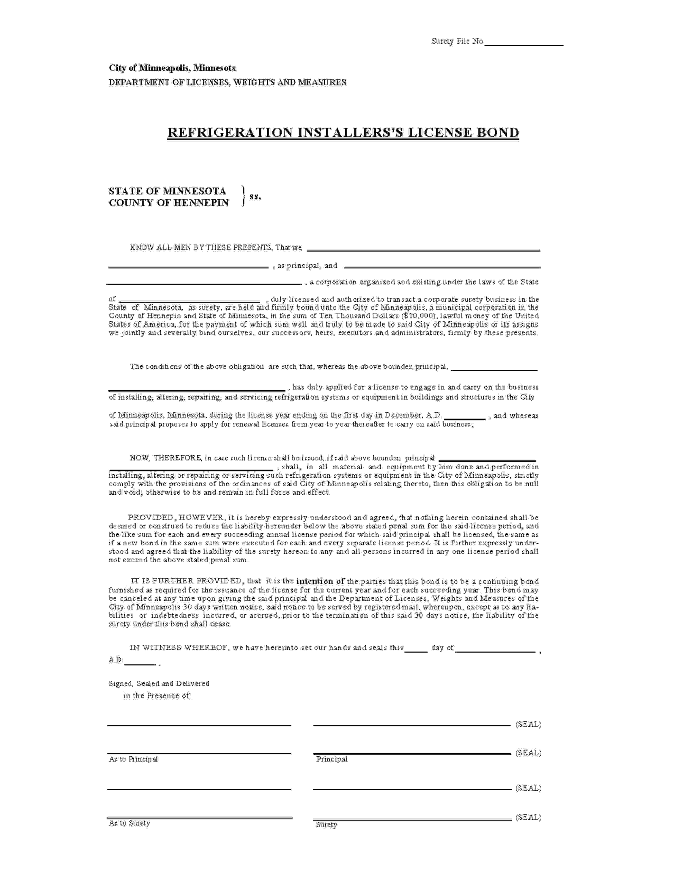 The Minnesota Minneapolis Refrigeration Installer Bond starts at $100 plus shipping costs and fees. Fill out the form to buy your bond instantly!