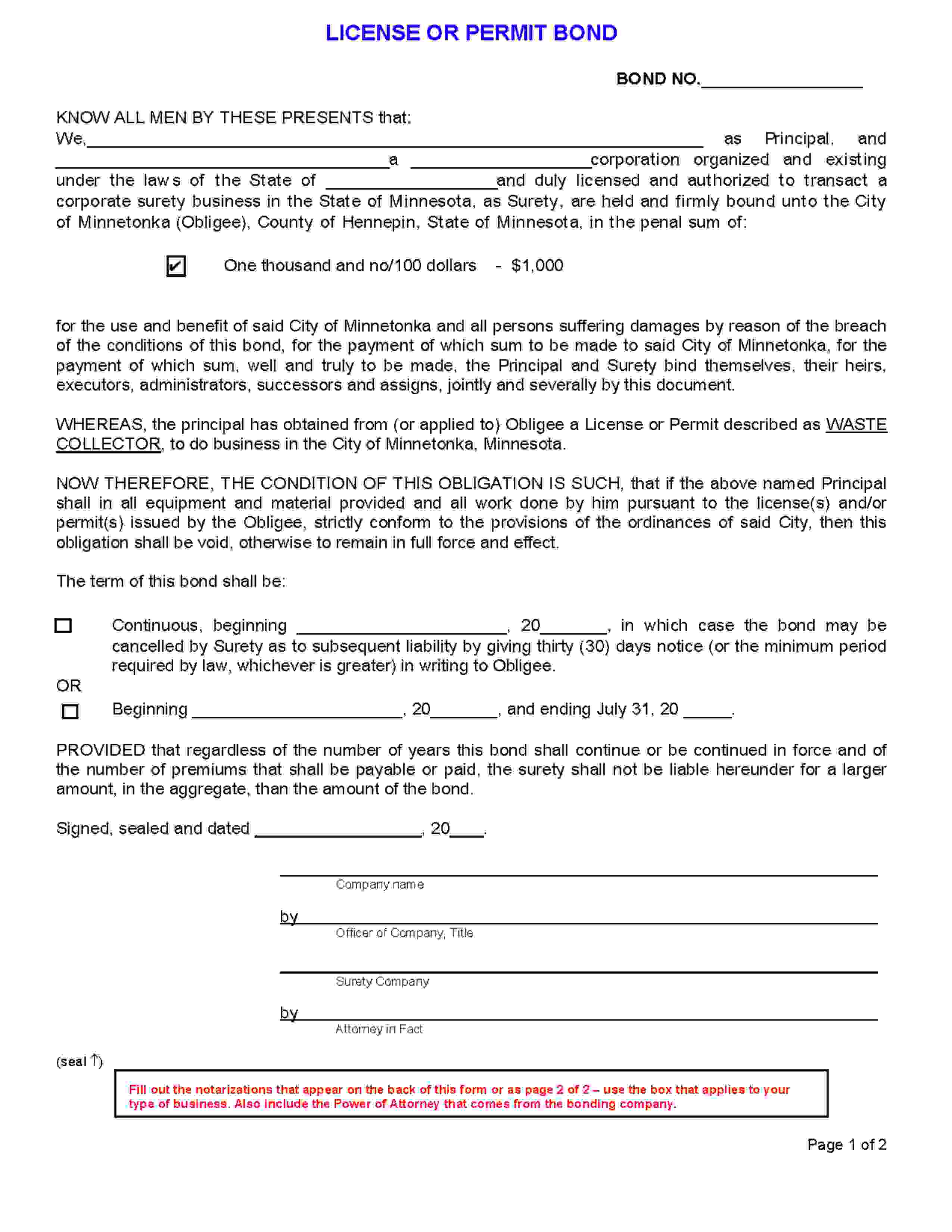 The Minnesota Minnetonka Waste Collector Bond starts at $100 plus shipping costs and fees. Fill out the form to buy your bond instantly!