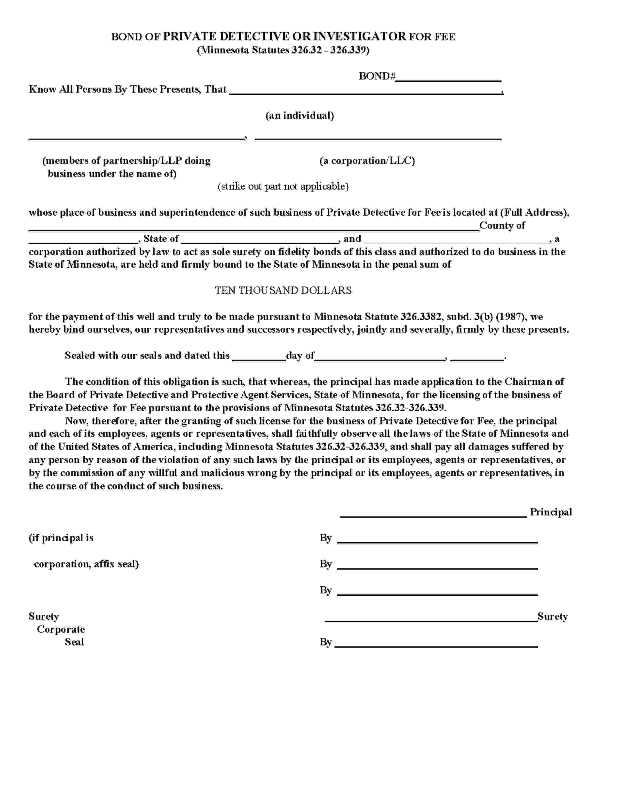 State of Minnesota Private Detective or Investigator for Fee Bond