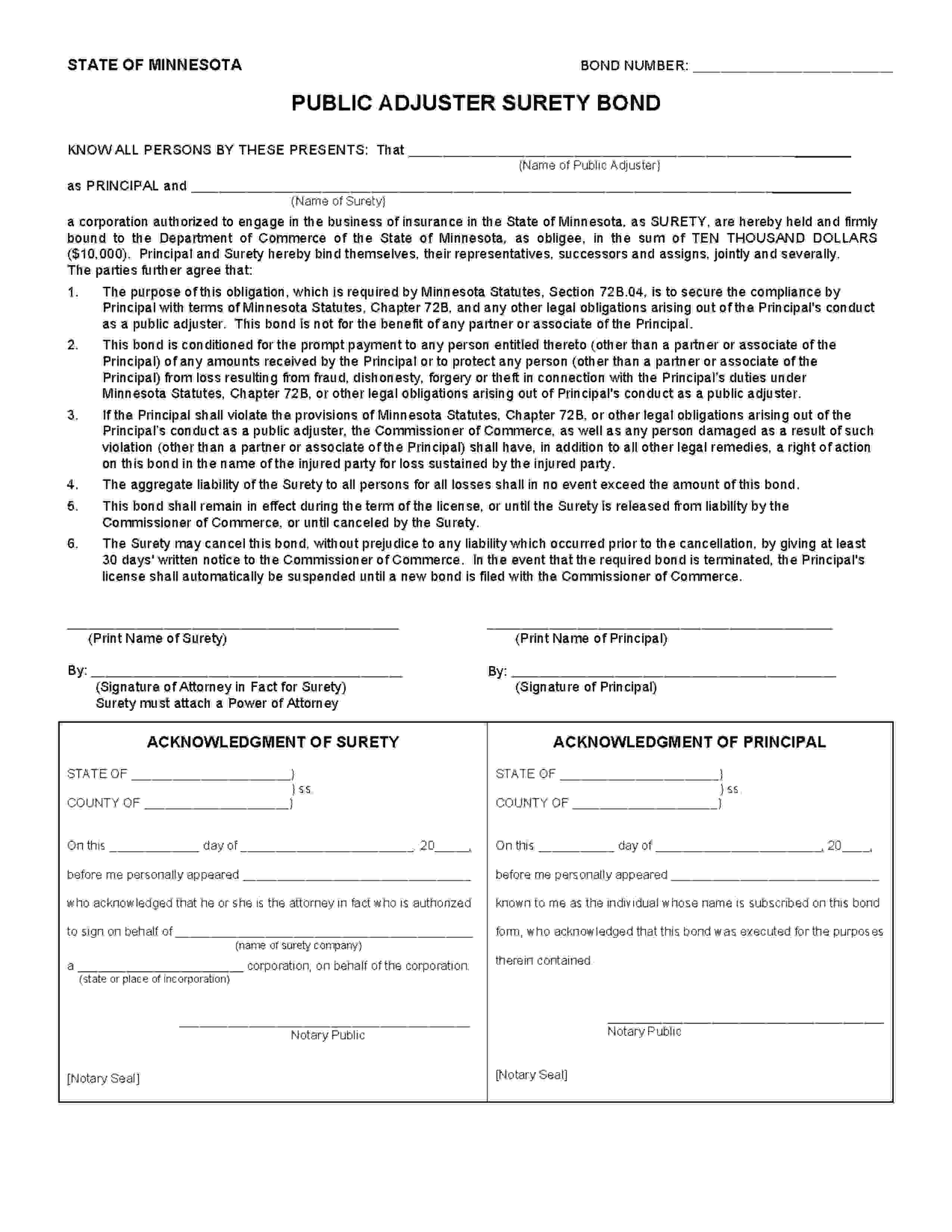 The Minnesota Public Adjuster Bond starts at $100 plus shipping costs and fees. Fill out the form to buy your bond instantly!