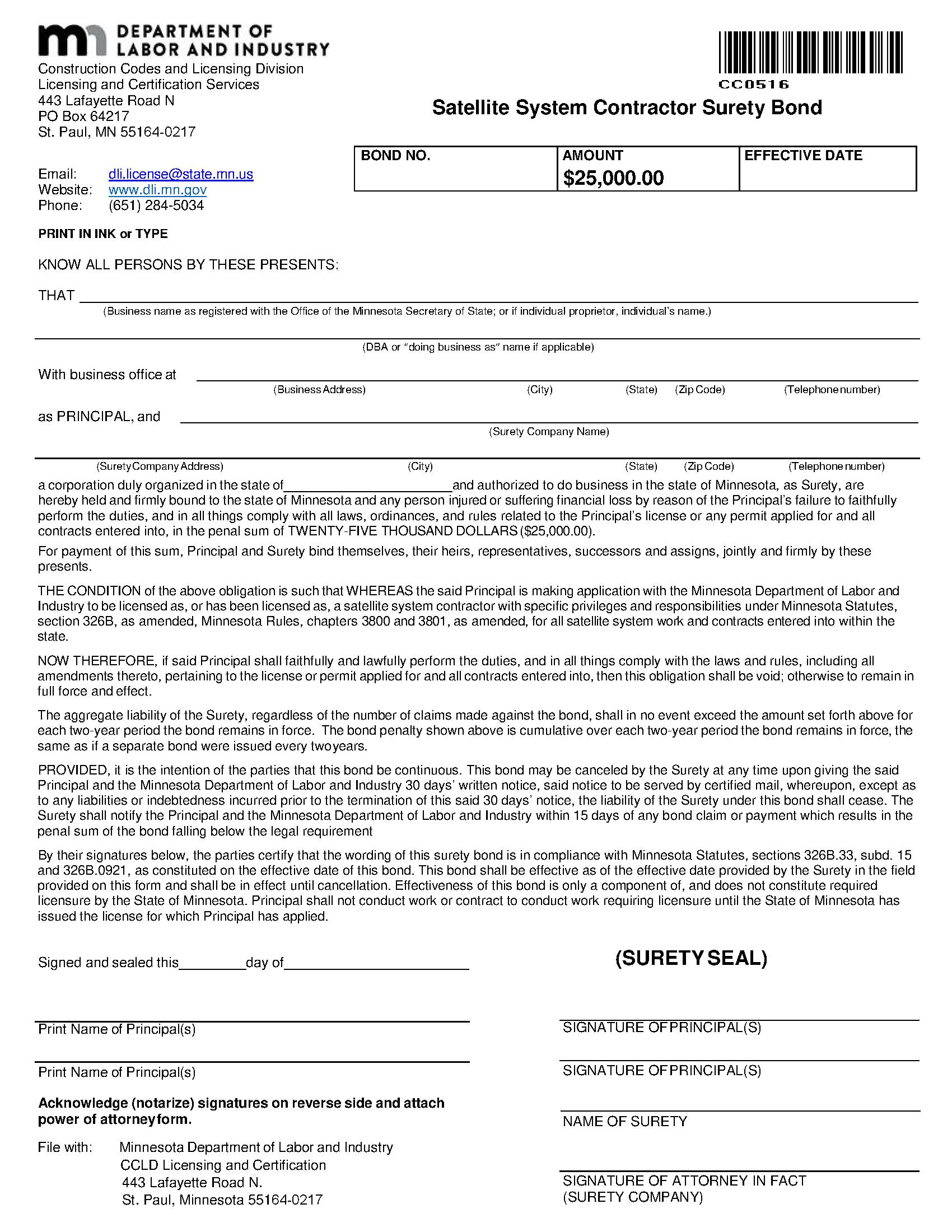 The Minnesota Satellite System Contractor Bond starts at $194 plus shipping costs and fees. Fill out the form to buy your bond instantly!