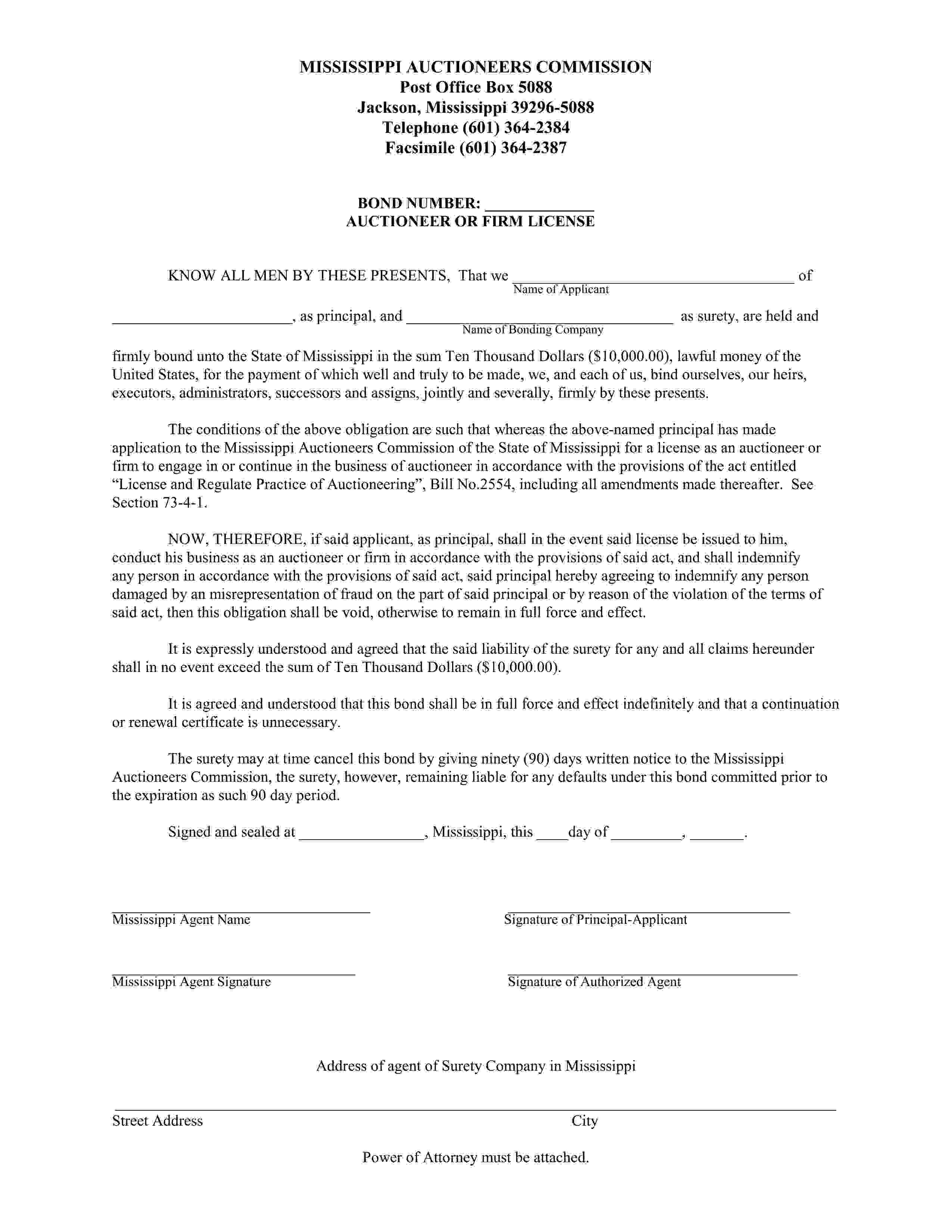 The Mississippi Auctioneer or Firm License Bond starts at $100 plus shipping costs and fees. Fill out the form to buy your bond instantly!