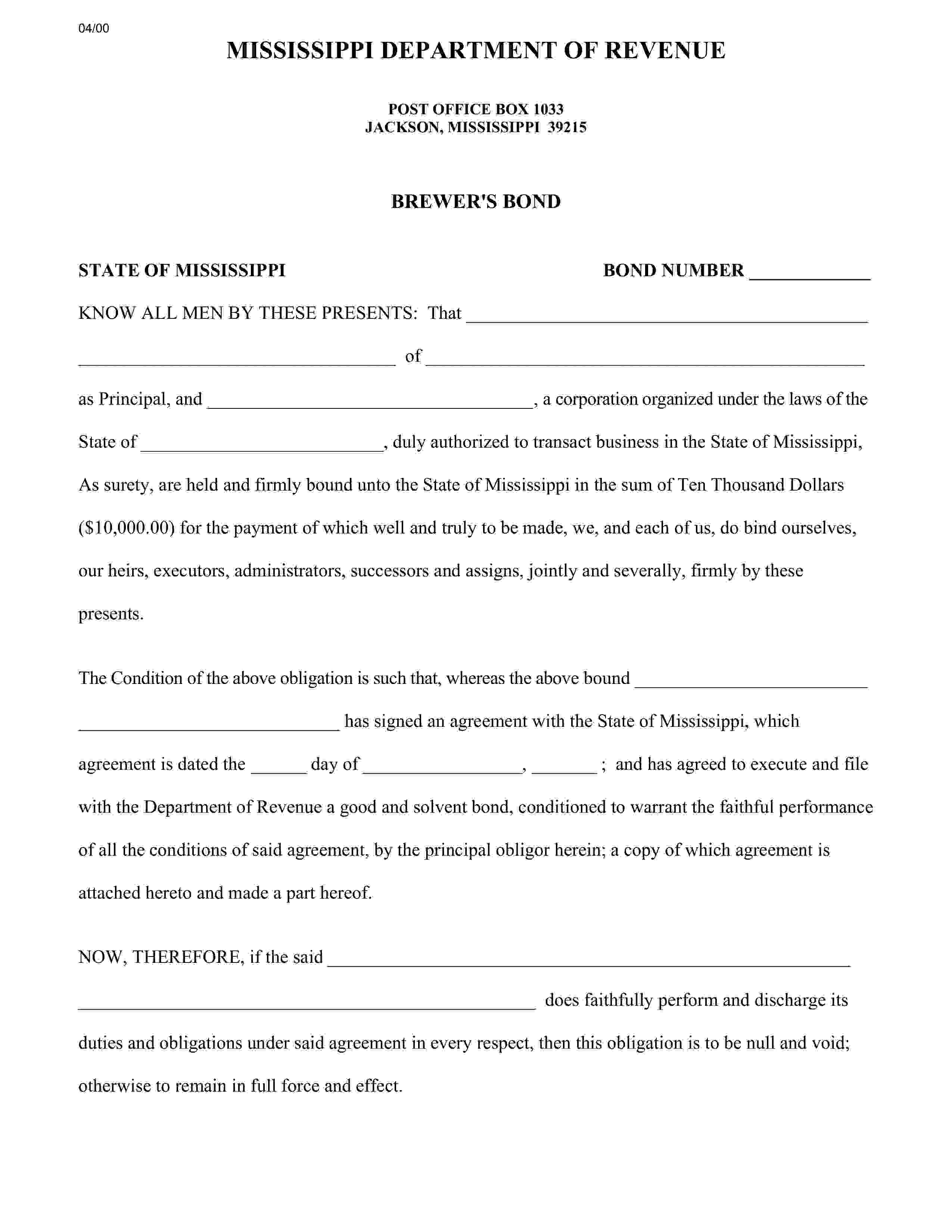State of Mississippi Brewers and Importers Bond