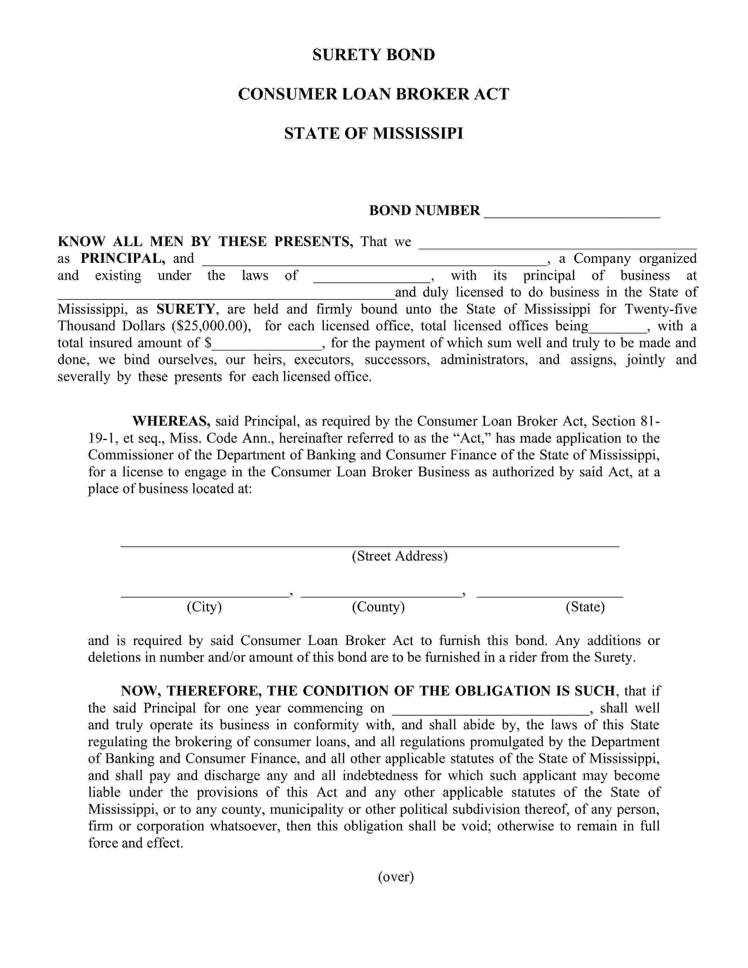 Mississippi Department of Banking and Consumer Finance Consumer Loan Broker Multi Offices Bond