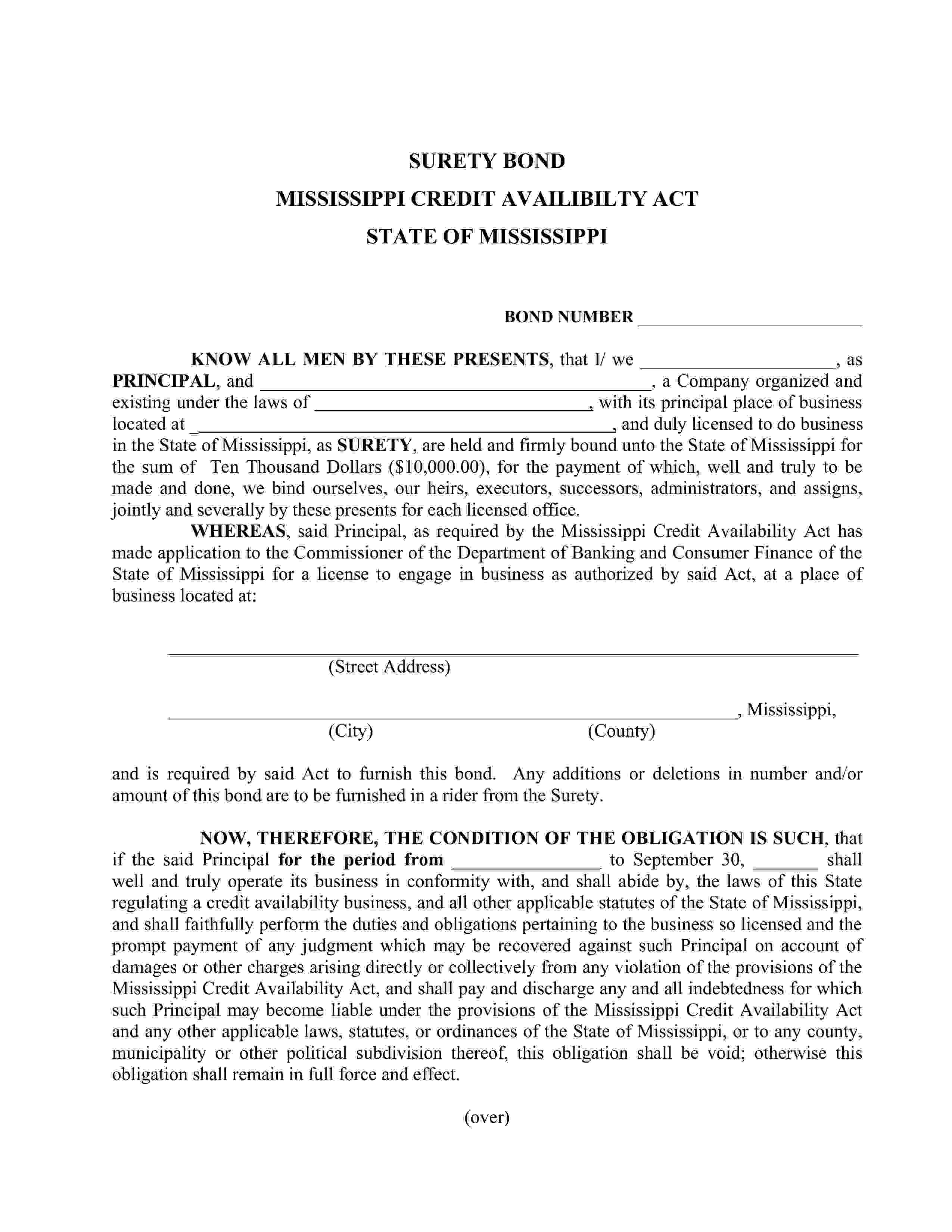State of Mississippi Credit Availability Company License Bond