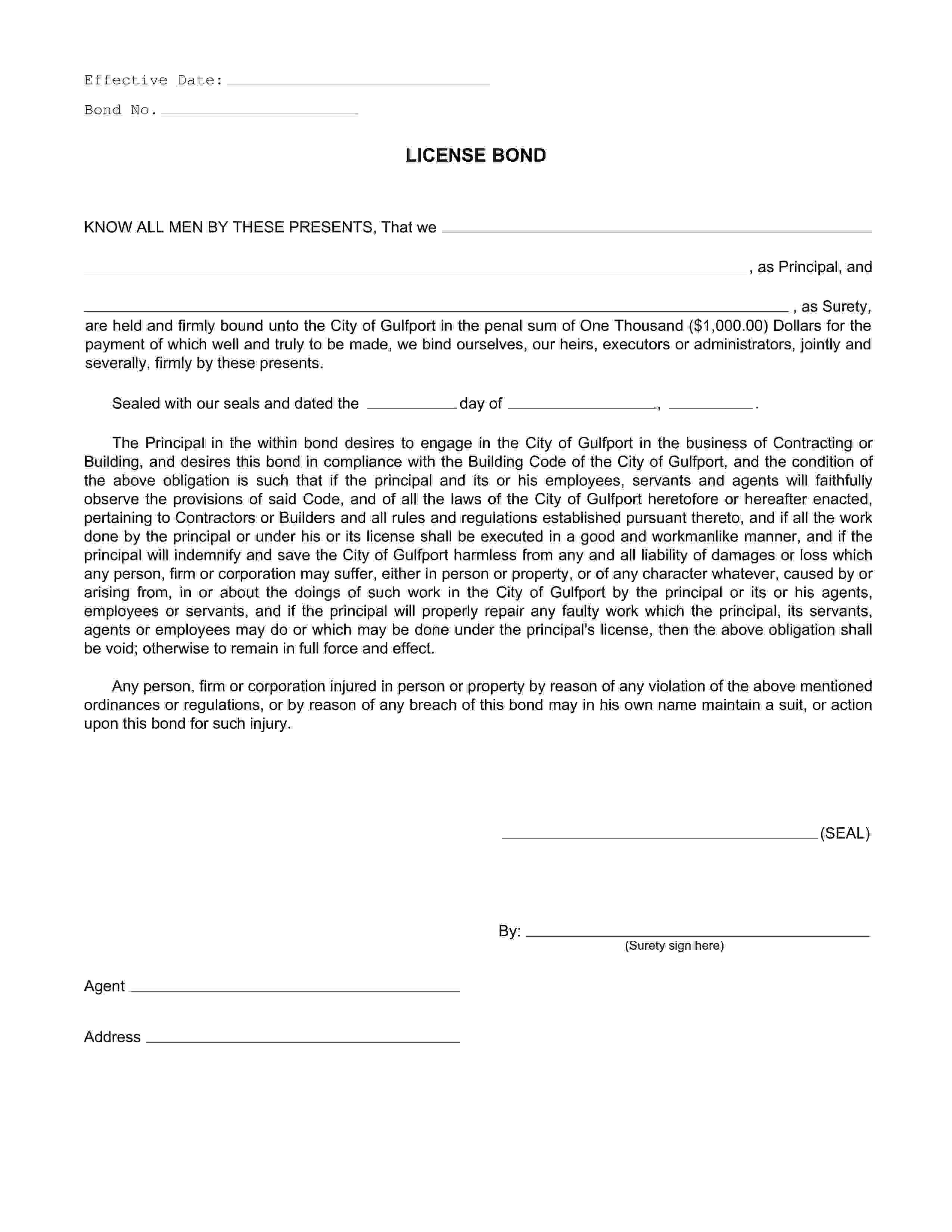 The Mississippi City of Gulfport Gulfport - City Contracting or Building License Bond starts at $100 plus shipping costs and fees. Fill out the form to buy your bond instantly!
