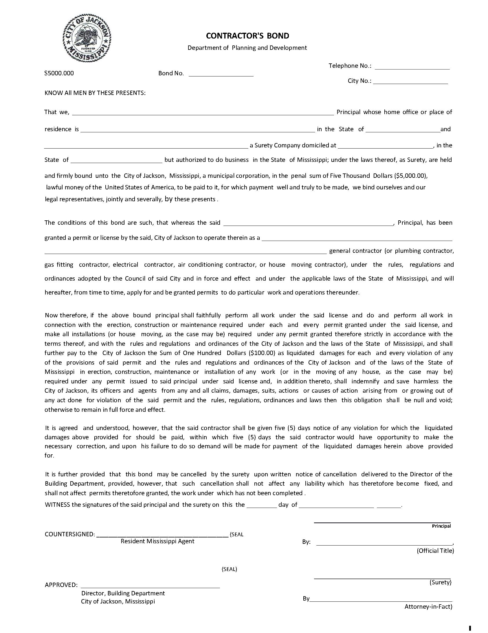 The contractor license surety bond ensures that the contractor follows ethical business practices while complying with all building codes and other rules and regulations listed in the Jackson Municipal Code – Title 15 – Chapter 15.36.