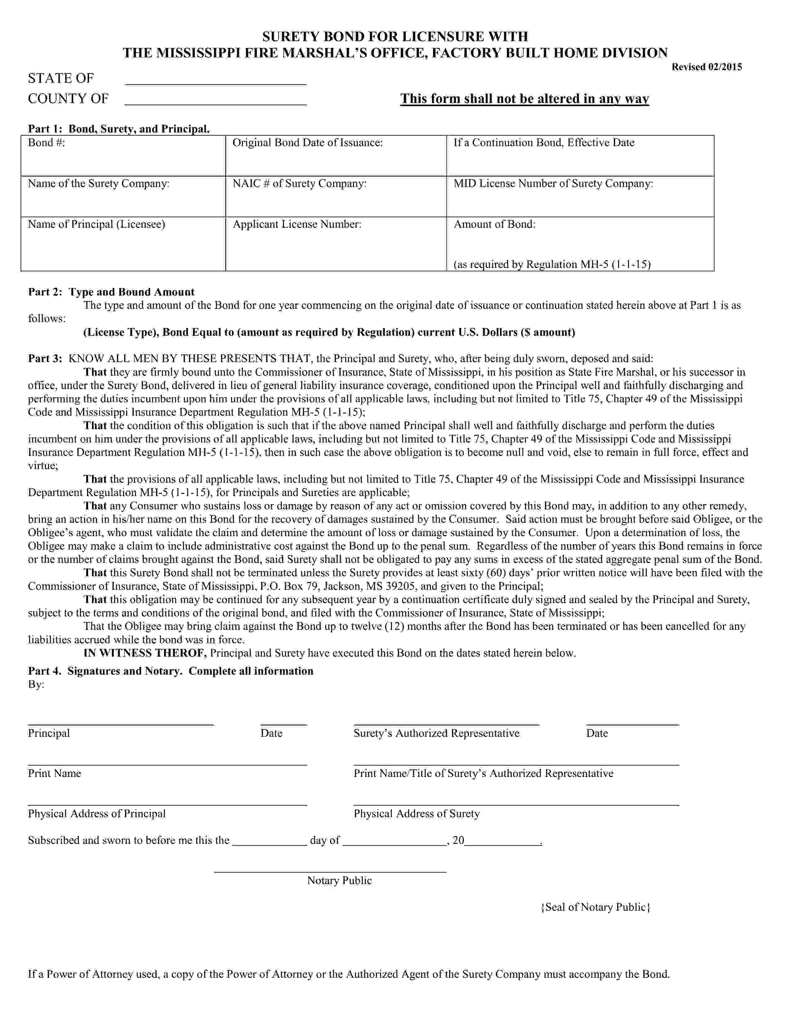 Mississippi Commissioner of Insurance Manufactured Home Manufacturer or Modular Contractor (Inactive) Bond