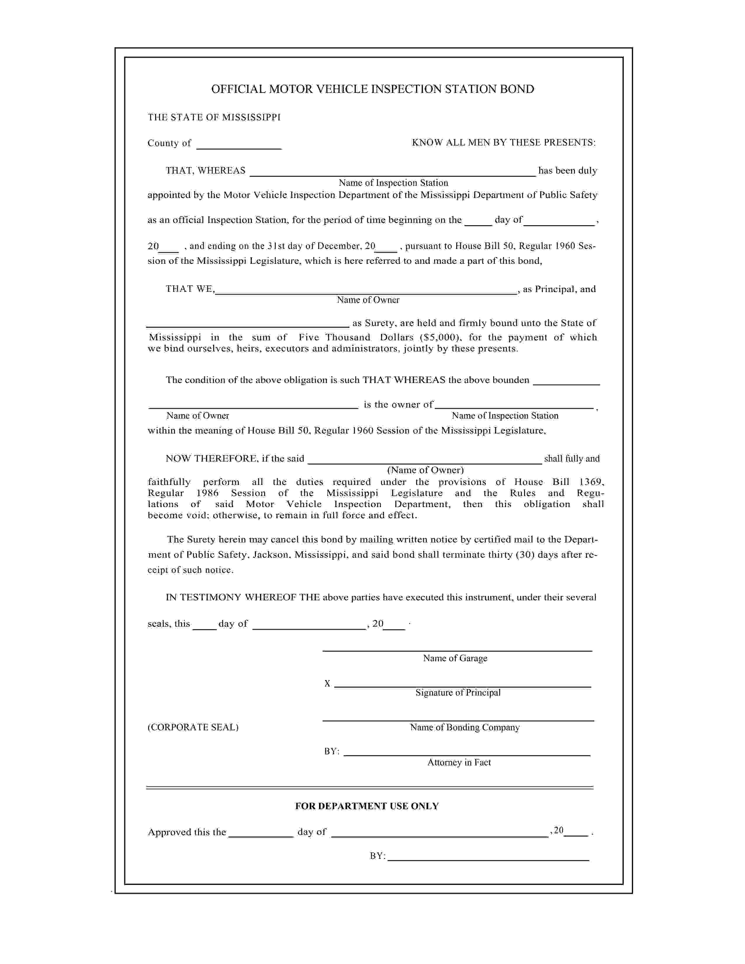 Mississippi Motor Vehicle Commission Motor Vehicle Inspection Station Bond